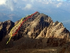 Ranný chládok ma zrýchloval a pribrzdilo ma až slniečko v sedle nad Tabaretou. Aj napriek občerstvovacej pauze sa mi podarilo vyjsť na Payerku za dve hodiny, čo bol sľubný čas. Na skalnom hrebeni, ktorým vedie ďalej výstup som bol prvý raz a musel som spomaliť kôli ťažšej orientácii. Aj tak som však napredoval pomerne rýchlo, kým som neprišiel ku kľúčovému miestu. Nevedel som o ňom a tak som sa exponovaný hrebeň pokúšal obísť sprava, keď sa mi to po dvoch pokusoch nepodarilo, tak už som vedel, že cesta musí ísť jedine hrebeňom. Rozdýchal som expozíciu a začal opatrne liezť skalným hrebeňom - na zostup som sa teda netešil.