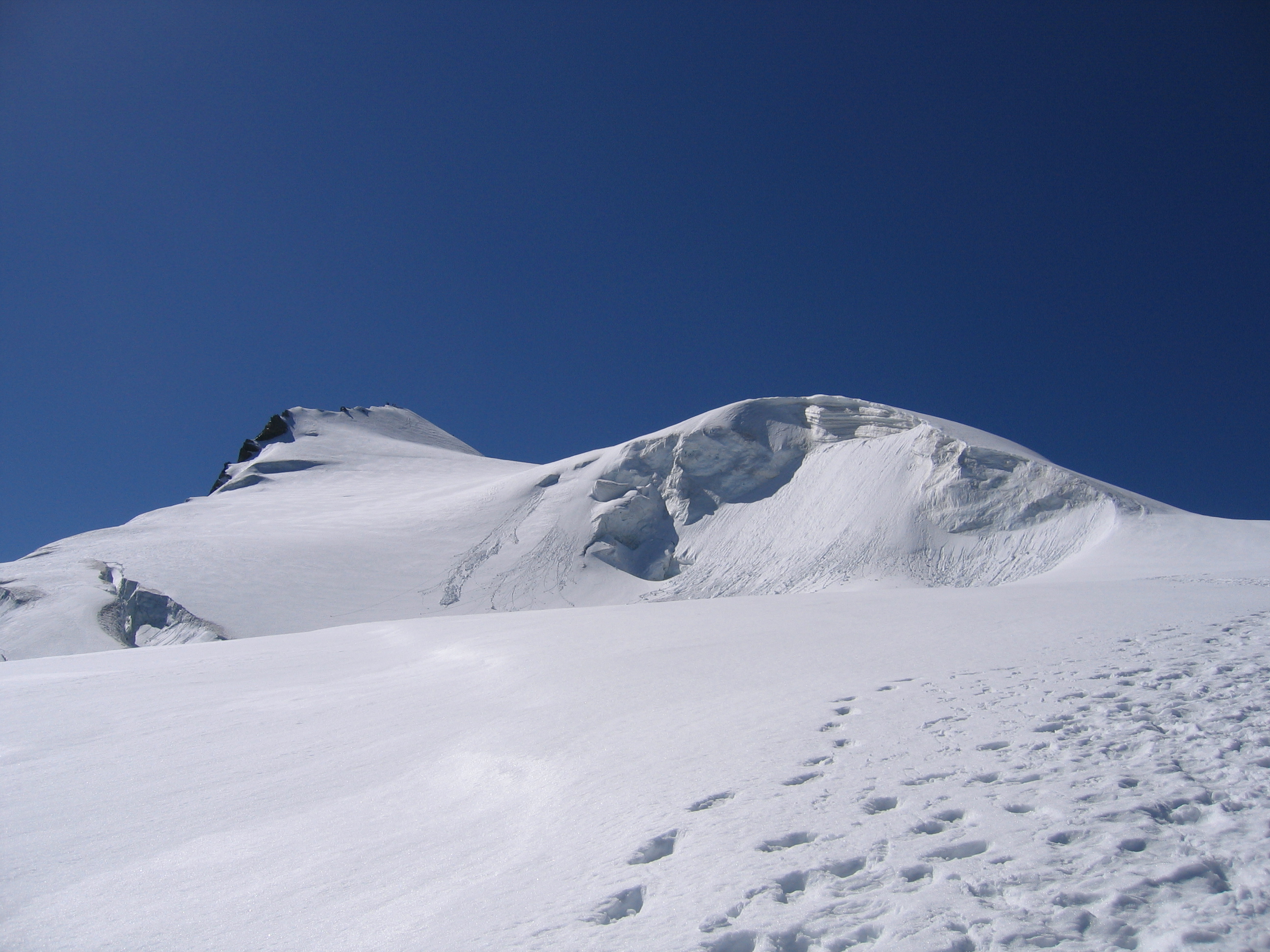 Za hrebeňom som obul mačky a po tvrdom snehu som postupoval rýchlo po peknej stope. Pod bivakovou búdou bolo ešte jedno exponované miesto, po jeho prekonaní sa mi otvorila už bezproblémová cesta k vrcholu. Trhliny boli v pohode, sneh bol tvrdý. Predbehol som niekoľko lanových družstiev, ktoré vyrazili ráno z chaty a na vrcholovom plate som začal míňať prvé oproti idúce skupinky z horskými vodcami. Na vrchole ma privítal silný studený vietor. Stopky ukázali čas 4h 4min.