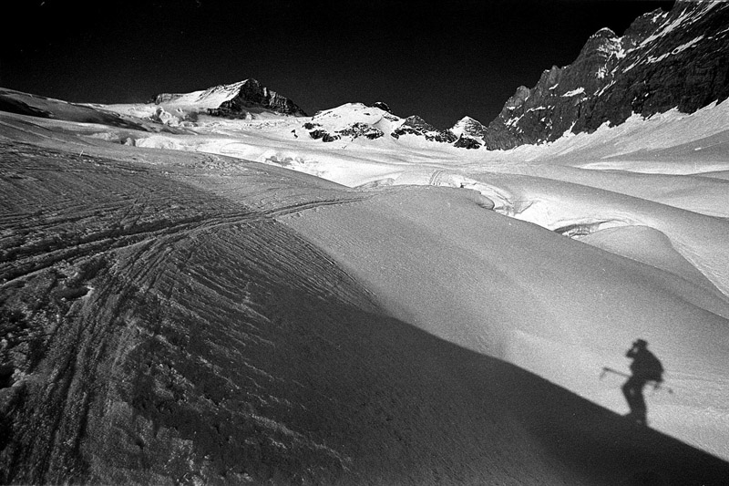 Začiatok nášho výstupu viedol cez roztrieštený ľadovec. Ak sa naň človek pozerá odspodu, alebo ešte lepšie v lete, nemôže si predstaviť, že tadiaľ vedie lyžiarska trasa. Okrem ľadovcového výstroja som vliekol aj fotografický výstroj - môj (vtedy) obľúbený aparát Zenza Bronica 6x6 s troma objektívmi, váha 6 kilogramov. Na to bolo treba mať dostatok motivácie.