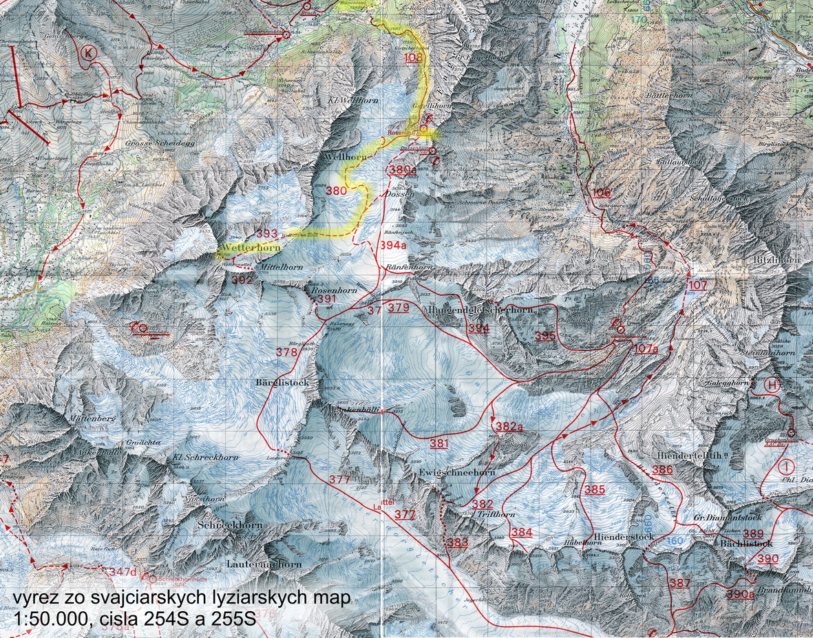 Cesta do bernských kopcov je ďaleká, musíme pretraverzovať Juru, sedlo Brünigpass, zísť k Brienzskému jazeru a zľadovatenou cestou sa vyterigať až do Rosenlaui. Je to ako Ho-Či-Minov chodník, známy z vietnamskej vojny. Auto sa šmýka v zľadovatených zákrutách. Na parkovisko dochádzame krátko pred pol siedmou. Príliš neskoro. Budeme sa musieť ponáhľať. Moji dnešní partneri sú ale vytrénovaní športovci, to je pre mňa znamenie že sa nebudeme flákať. Osvald, najmladší a najsilnejší z nás, bežal na čele ako poľovnícky pes, prenasledujúci svoju korisť. My s Petrom sme robili, čo sme mohli, aby sme neostali v hanbe. A hlavne aby Osvald vždy ostal v našom zornom poli. To sa nám nakoniec aj podarilo. V sedle Wettersattel sme Osvalda nakoniec dohonili. Zahodíme lyže a hurá, na posledný kus cesty. Nenaviazaní, bez lana.