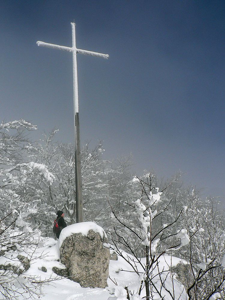 Po obhliadke sme sa teda pobrali - čoraz vyššie a nohami čoraz hlbšie. Žltú sme síce na chvíľu hneď na začiatku stratili, potom ale už bez pochýb až do konca – stromy našťastie nemali snehom obalené kmene, len koruny. Ešte sme si vychutnali krátku (značenú) odbočku a návštevu jednej z mnohých jaskyniek v tomto vápencovom masíve, a nasledovala dlhá, strmá a výživná robota až ku krížu.