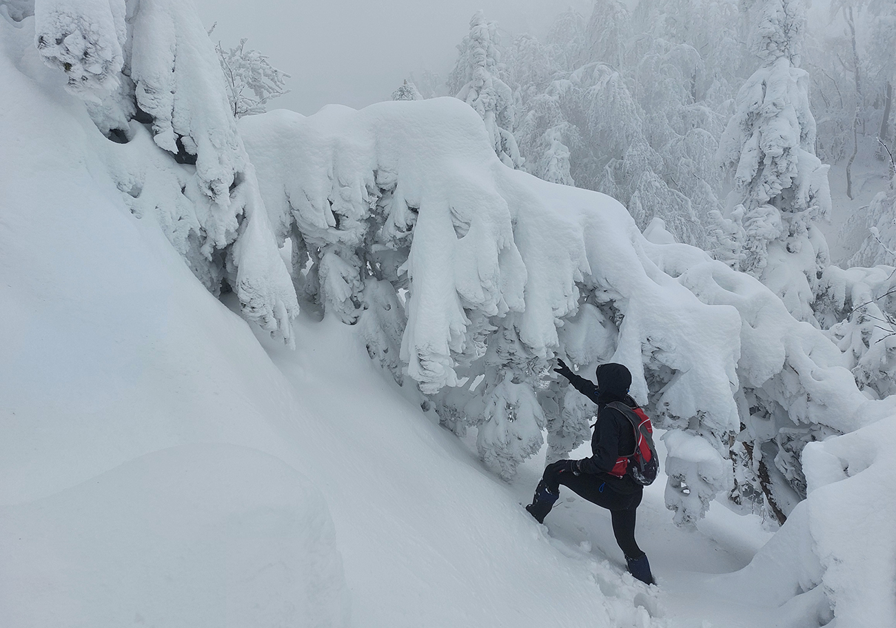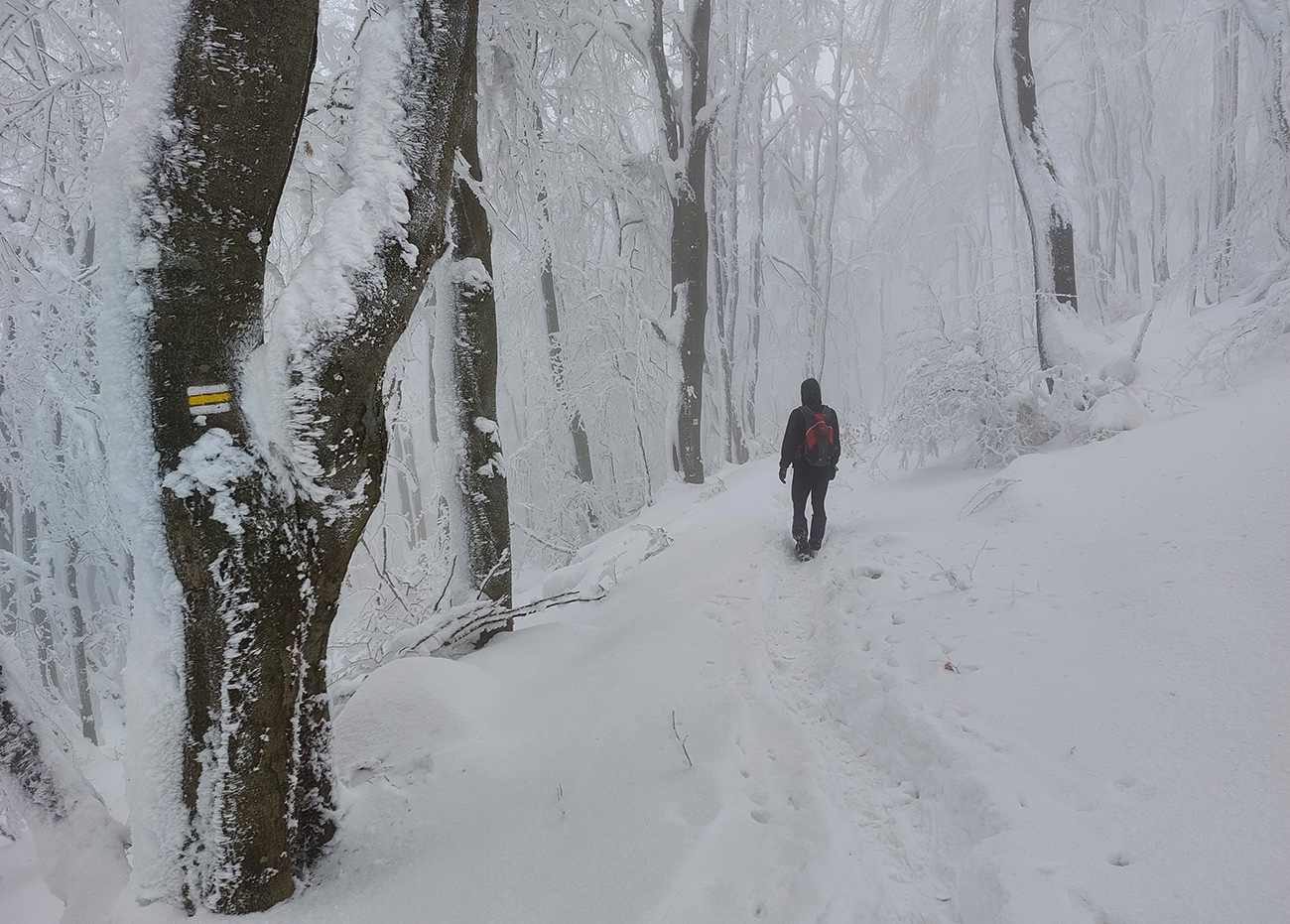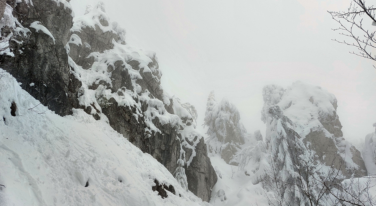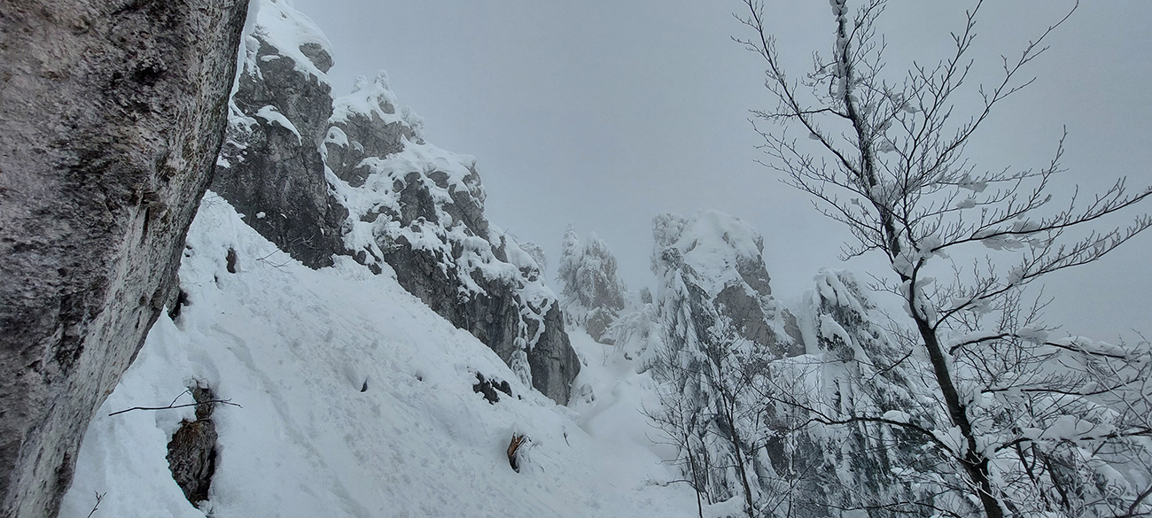 Netreba sa diviť, prečo nebol z tejto strany a o tomto čase chodník prechodený – je to superstrmý výstup, náročný aj za sucha. Obielené stromy a s výškou pribúdajúce skalky, bralá a vežičky mu ale teraz dodávali osobitné čaro, a keďže sme sa neponáhľali, bolo pri vydýchavaní aj napriek hmle a čiernobielemu svetu stále na čo pozerať.