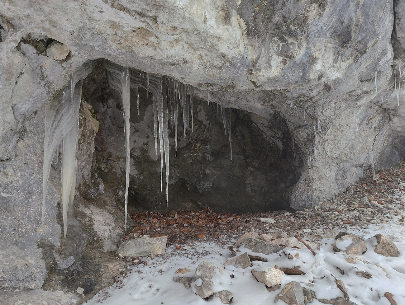 Takže cesta dole – už jedna báseň. Ale neodpustili sme si zachádzku k jaskyniam a previsom pod bralom. K najväčšiemu previsu s ľadovou výzdobou, ktorá isto mala grandiózne rozmery, sme sa cez klzké snehové nánosy radšej neštverali, ale susedné, menšie jaskynky a portáliky to sčasti vynahradili.
