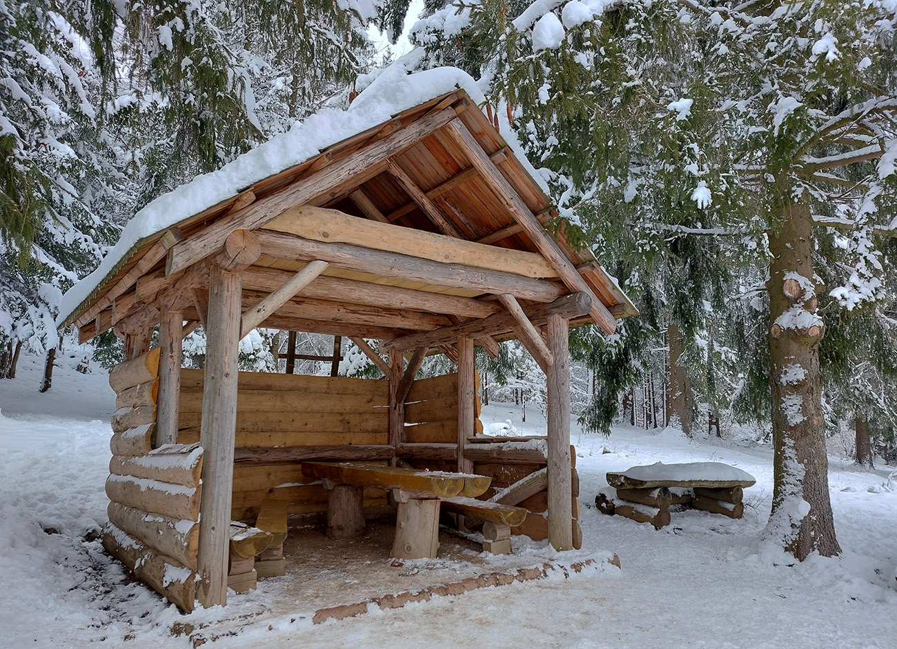 Potom už len pohodlný zošup dole lesom do Žaškovského sedla, po mäkkom snehu, miestami ako v bobovom tobogáne. Aj sme trochu kopli do vrtule, pre istotu, žeby nám vlak neušiel. V sedle na lúkach čisto bielo, len ojedinelé stopy na obe strany do dedín. A pod lesom relatívne nový prístrešok – vidno, že miestni turisti sa starajú.