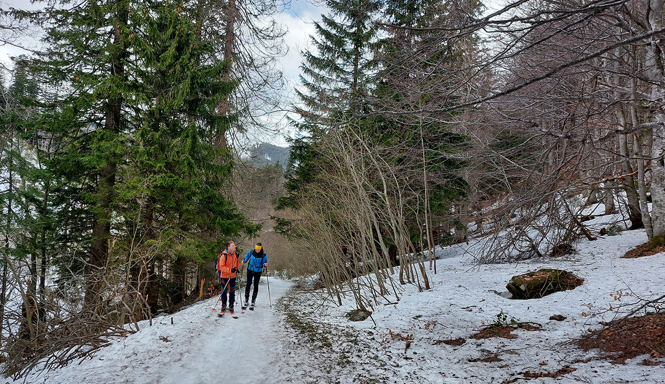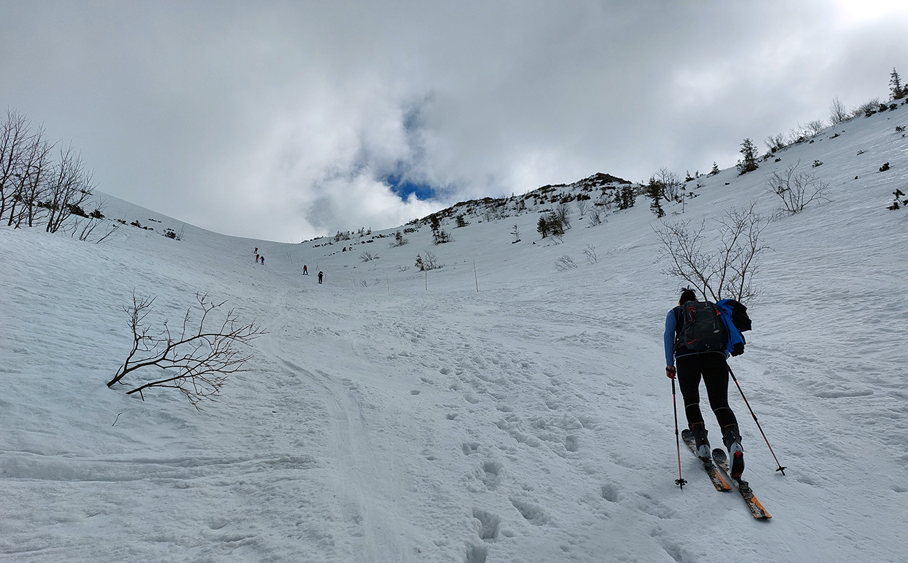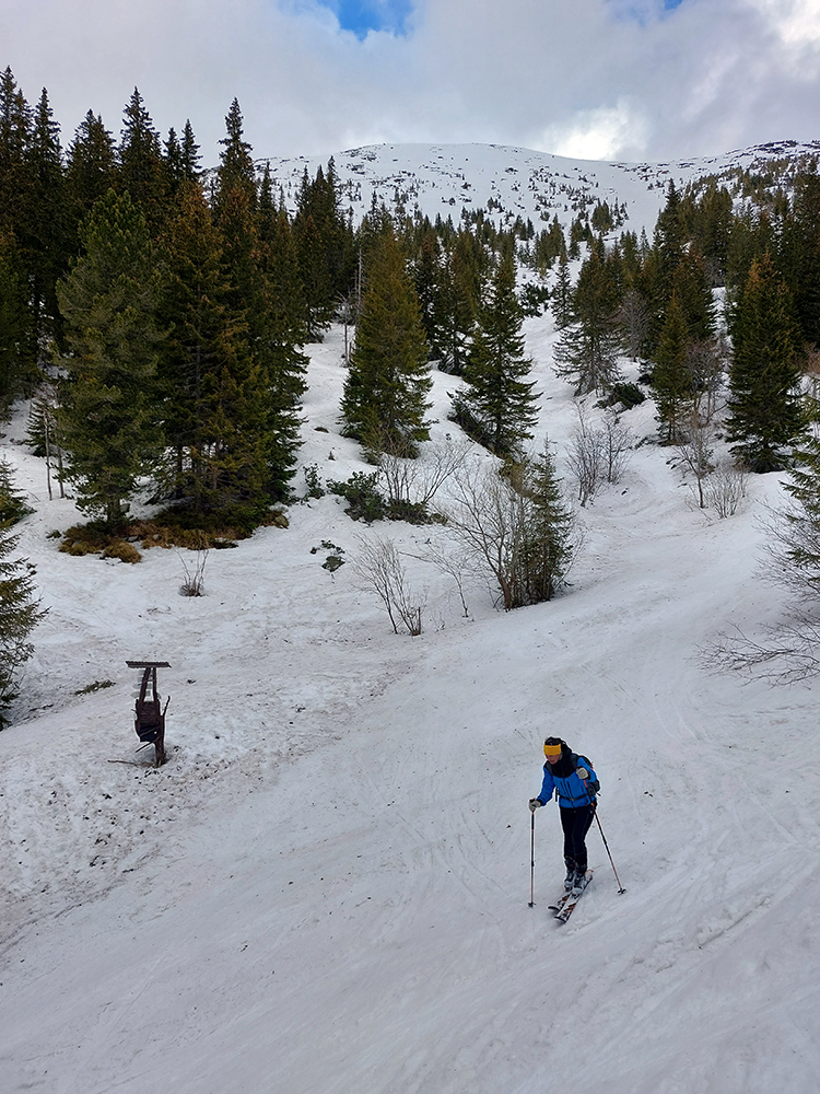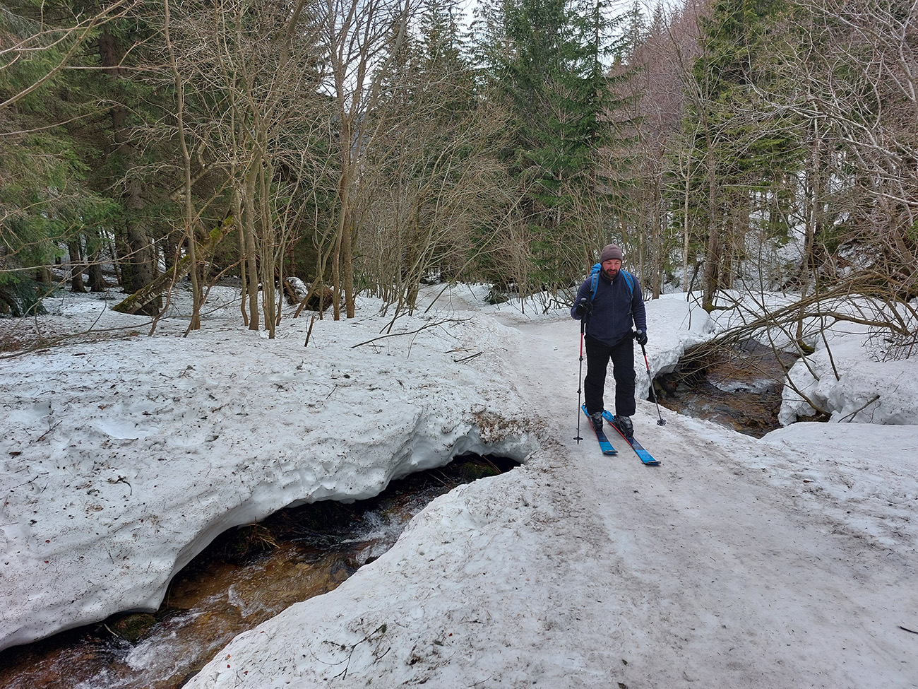 A bol čas to teda dotiahnuť na ten Ďumbier, keď už sme tam pod ním stáli. Odhlasovali sme si to 3:1, slabší kus kvôli bolesti v kolene to radšej neriskoval. A dobre spravil, lebo posledná lyžba, do Halašovej jamy, to bola zvrchu hnusná vytriasačka na drssssnom betónovom firne. Nižšie sa k drsnosti pridali zamrznuté ryhy a hrče a až dole v lese to už bolo jarne mäkké a hravé, lebo aj vyšmýkané.