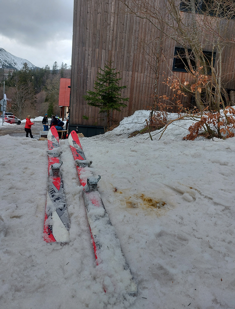 Takže úvod hore na MRŠku spočiatku pohodový, firn sľubne natopený, tiahli davy. Vyššie už to tuhlo, ale výborne držalo, na tom šmirgli. A hore na križovatke zrazu padla dohoda, že najprv do chaty. A tam keď už začali kolovať štamperlíky, už sa dalo tušiť, že to bude na pohodu, nie na výkon. Aj keď ani ten výkon nebol plánovaný. Ale veď dobre, možno aj rozlúčka so zimou to bude, treba jemne. A bola by aj štýlová, lebo presne TU , o kopec vedľa, sme ju zahajovali, presne na nový rok.