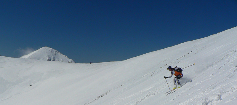 Tak aj bolo a po rozohriatí hore cestou (inak zamračené, pofukovalo, aj sneh popadával, čo to???) som sa nad chatou napojil na komfortne vyleštenú čerstvú stopu, čím vyššie, tým hlbšiu. To už sa mraky trhali o 106 a modrej bolo čoraz viac nad hlavou. Na Terasu viedli parádne serpentíny, ale okolo hnusná kôra, lyžovačka tadeto dolu bude o držku, kým sa to nerozjazdí. Hore sa z troch strán ozývalo nadávanie organizátorov na hlboký a ťažký sneh :-) Pod Smutným sedlom bolo vidieť plaziť sa deväť bodiek, vybral som sa najskôr tam. Dobehol som ich ale až hore (nie naschvál!), tak som moc nepomohol, ale priznám sa že sám by som hore nešiel. Zo severu tam toho bolo nafúkaného strašne moc a na slnku už to aj moklo. Lyžba nazad na Terasu nič moc, hore hlboký a ťažký, dole tvrdé dosky.