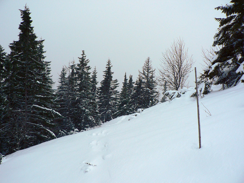 Popod Dereše je to riadny boj, chodník je v závetrí a vietor tu toho naukladal až - až. Pred sedlom Poľany stretám dvoch a neskôr ešte dvoch ľudí, všetci idú z Ďurkovej. Vraj je to ďalej celkom dobré, moc sa to neborí. Teším sa že konečne bude stopa, ale už pod Kotliskami je beznádejne zaviata. Asi dvakrát sa v mrakoch ukáže žlté koliesko, dáva nádej. Ale sneží čoraz hustejšie, len vietor našťastie fúka do chrbta.
