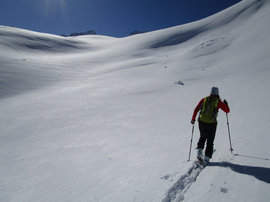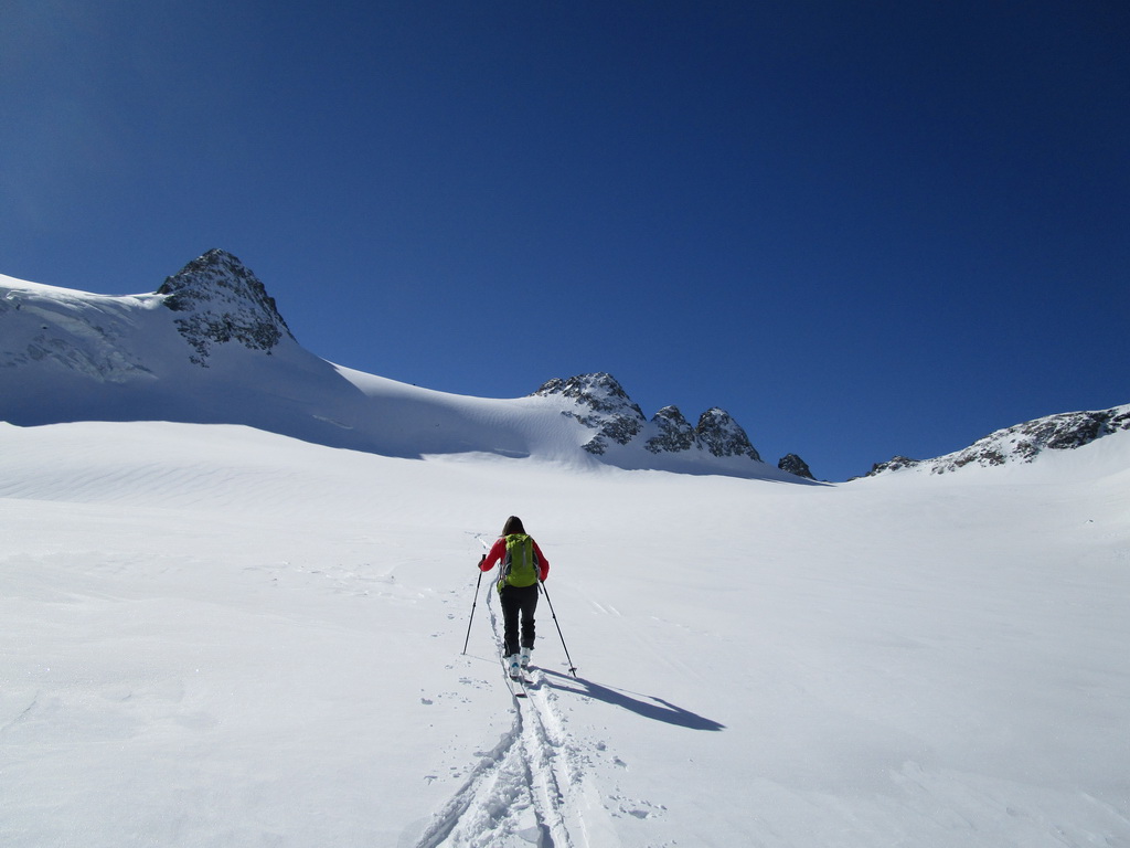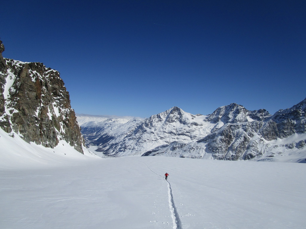 Vybrali sme sa hore svahom popod Chaputschin traverzujúc úbočia mierne vľavo. Ponad zrázy siahajúce až ku ľadovcu sme sa dostali na rampu ktorá je zo spodnej časti ohraničená ľadovcom a zhora už je stena Chaputschinu. Zaujímavé miesto s úžasnými výhľadmi. Pretraverzovali sme na plochý ľadovec. Nebezpečenstvo trhlín tu bolo minimálne a tak sme sa v pohode po miernom ľadovci dostali až do Fuorcla Chaputschin. Odtiaľto sú výborné výhľady do Val Fex ale vidieť oveľa viac...