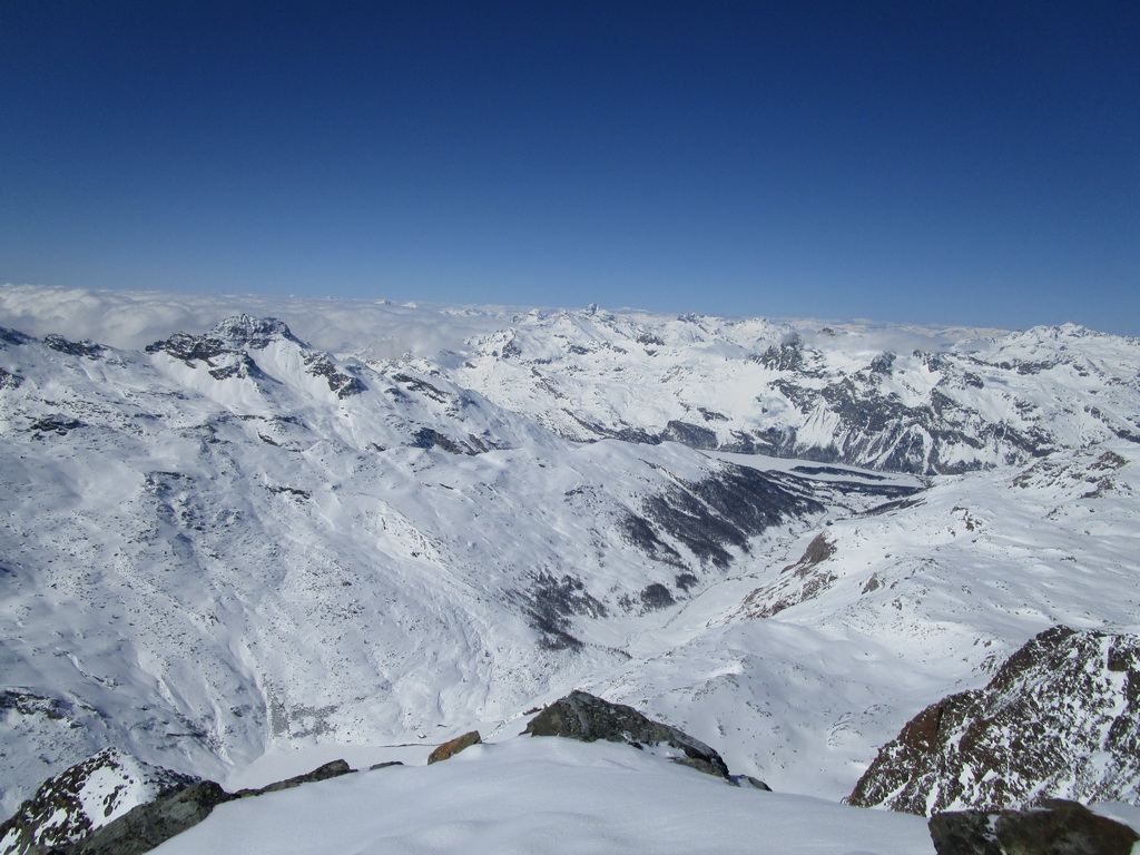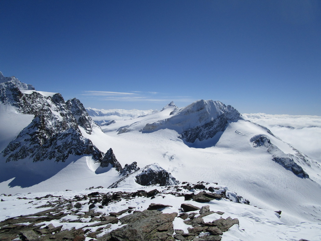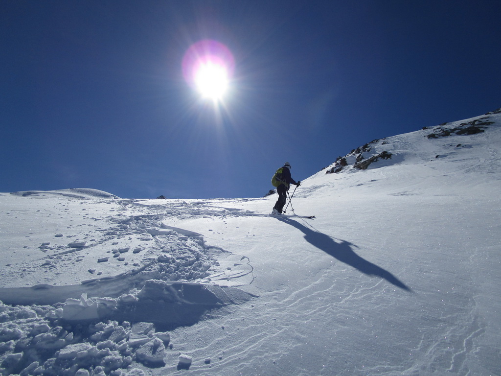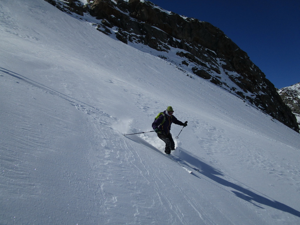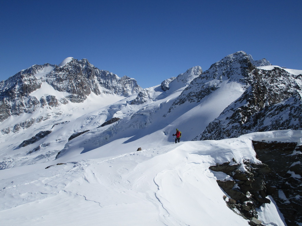 Po hrebeni s výhľadmi všade naokolo sme postupovali smerom ku vrcholu Chaputschin. Otočili sme sa na kopčeku s ešte značným odstupom od vrchola. Čakal na nás parádny zjazd prašanom ale aj kôrkou od vetra naspäť ku chate. V ten deň sme sa ešte museli presunúť dole do doliny ku hotelu Roseggletscher.