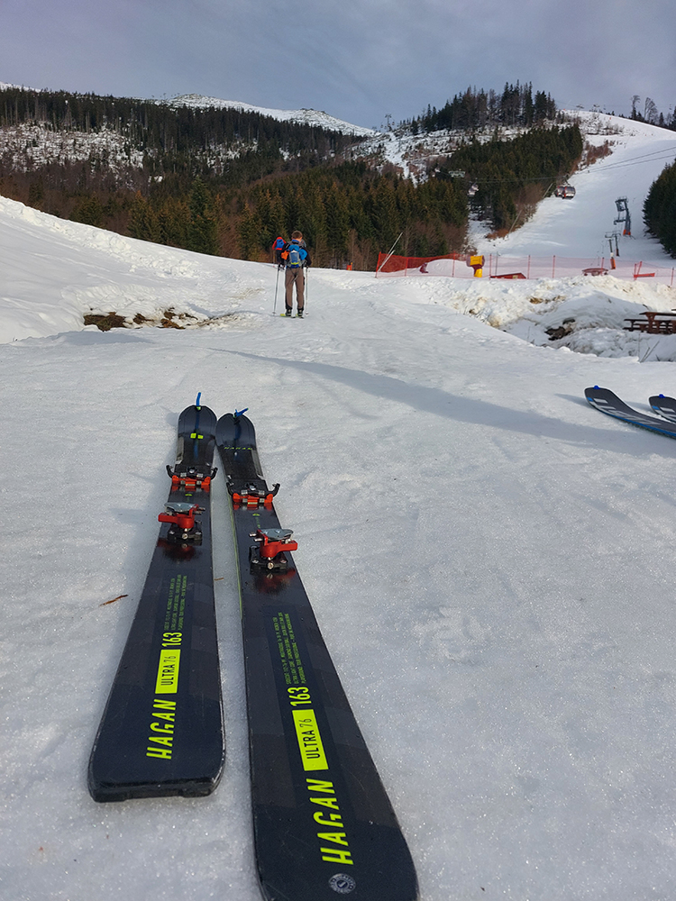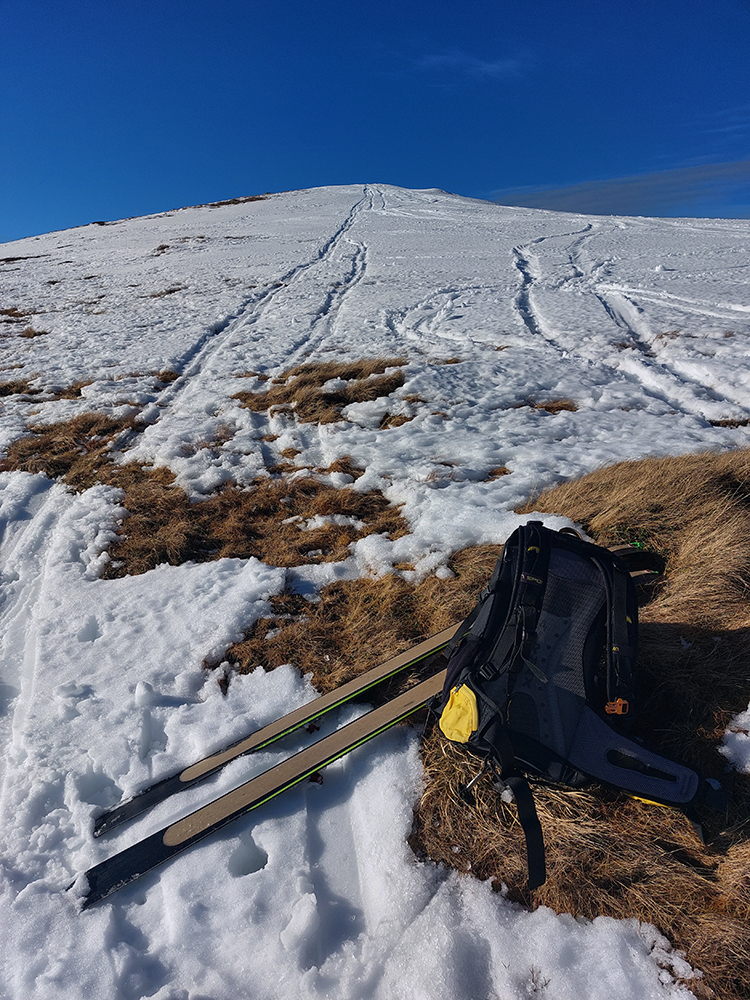Stopa vyleštená a pevná, ale nešmýkalo sa ani v strmších pasážach – pekne to lepilo. Pásy samozrejme mokré durch, už po pár metroch a čím vyššie, tým aj teplota vzduchu vyššia. Miesta aj snehu našťastie dosť aj pomimo zjazdovky. Aj čistý bol, len buriny z neho trčali ako dôkaz jeho nedostatku.