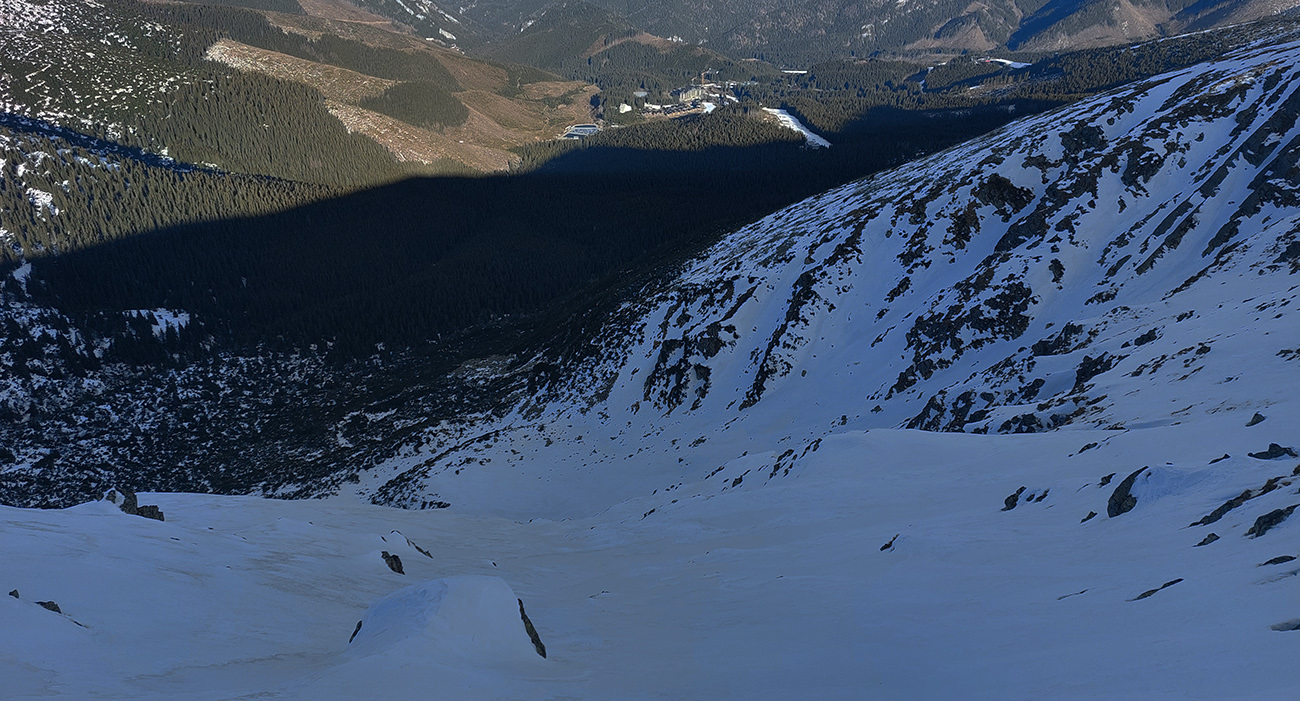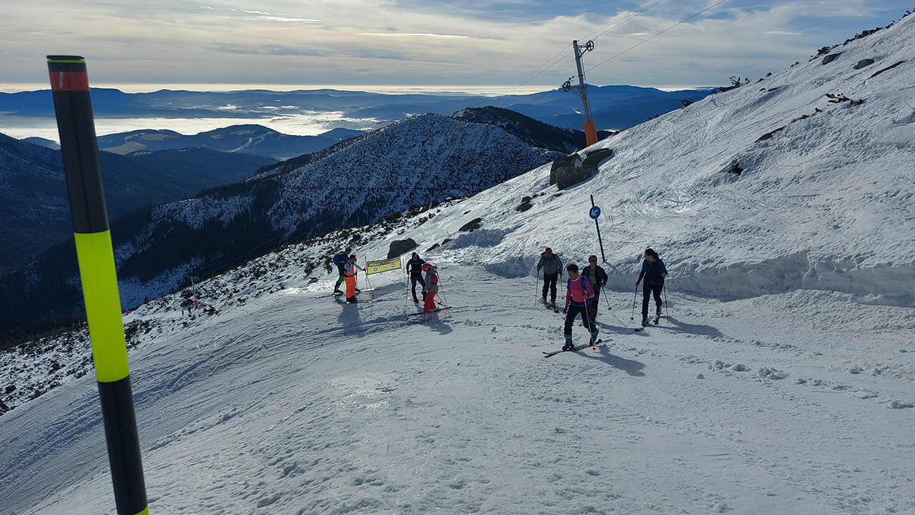 Len o kúsok vyššie „od úpätia“ sa vďaka rúbaniskám a priesekom zjazdoviek začali otvárať tie notoricky známe panoramatické výhľady – žiaľ teraz najmä na okolitú snehovú biedu. Dominovali tmavé farby a v diaľke na juhu Klenovský Vepor. Podklad mimo pisty sa zdal byť pevný, ale kto si trúfal vyskočiť z lyží, hneď bol po kolená zapadnutý do mokroty.