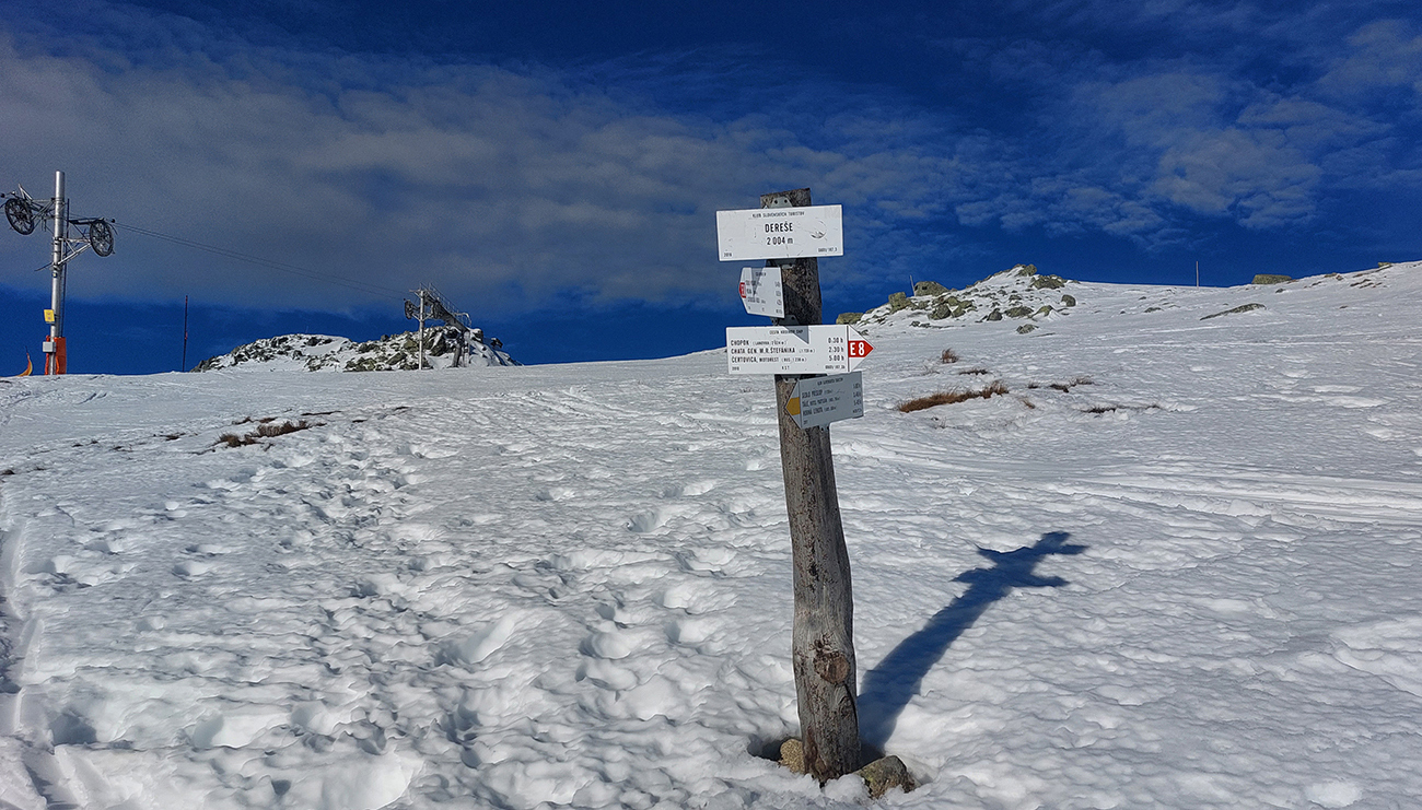 Ešte vyššie ešte teplejšie, a keď spoza riediny mrakov vyliezol Oskar, hic jak v júni. Pod nohami tiež prehnitá riedina - no fuj, už aby to zamrzlo. Vycikcakovali sme pod Dereše, až ku hornej stanici vleku. Ale nie úplne po výstupovej – lebo ako začala na úzkej piste hustnúť premávka, ušli sme radšej medzi šutre a kosovku štrikovať. Miesta už dosť a neprepadávali sme sa, zatiaľ.
