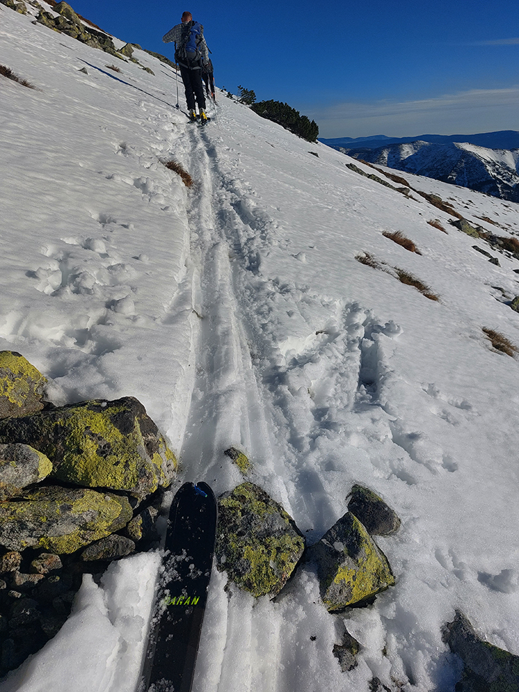 Hore rozhodovačka, že kam a že vôbec čo tu... Vyhral návrh ísť sa pozrieť do sedla Poľany, či sa nebude dať zjazdiť do severu. Skúsili sme síce aj pár oblúkov spod Derešov na juh, ale bol to tragický prepadák, navyše bez podkladu, takže žraloky striehli tesne pod hladinou, žiadna radosť z pohybu. Ale aspoň sme zišli hlbšie pod hrebeň, kade sa smerom na západ dalo lepšie traverzovať, bez prílišného kľučkovania pomedzi kamene.