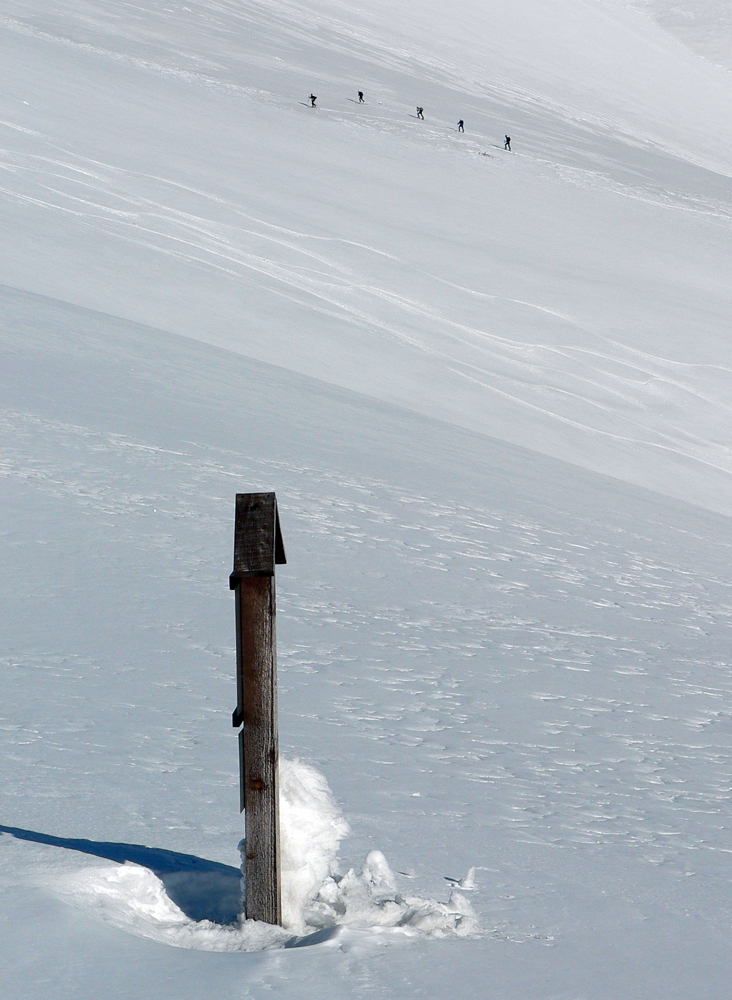Teplota tiež príjemná jarná, jemne nad nulou, celý deň som šiel bez rukavíc, bez čapice, bez bundy. Aj keď stretol som partiu naloženú poriadne na ťažko, a pritom obalenú „v goráčoch“ aj s kapucňami. A jeden mal aj lyžiarske okuliare! Možno sa radšej potil ako opaľoval :-) Severáčik taký jemný, akurát osviežoval, bez neho by bolo prihorúco.