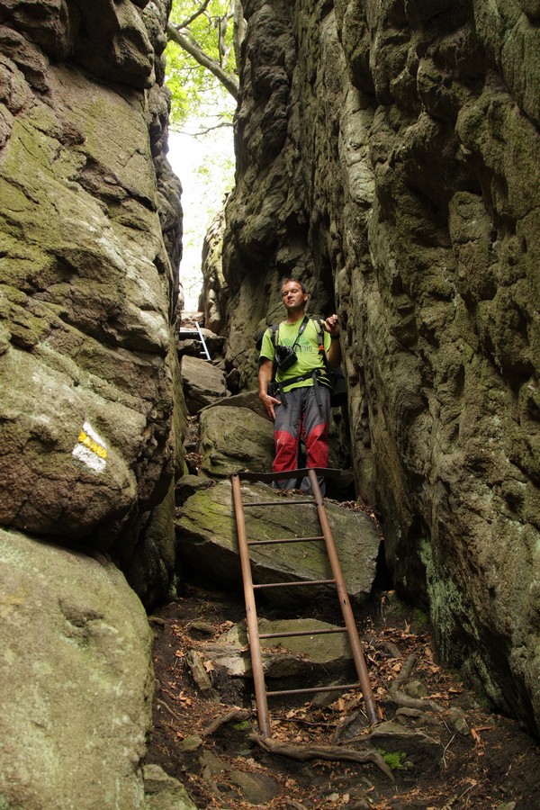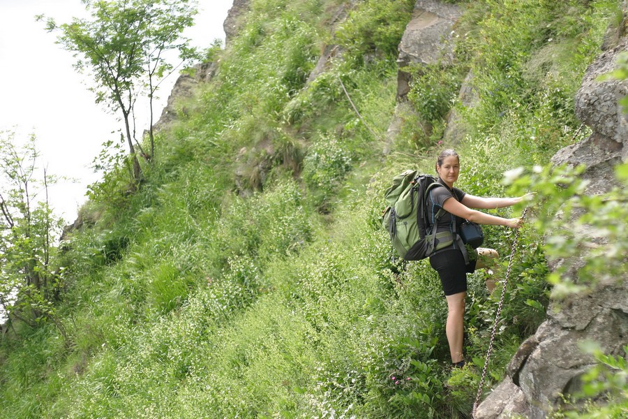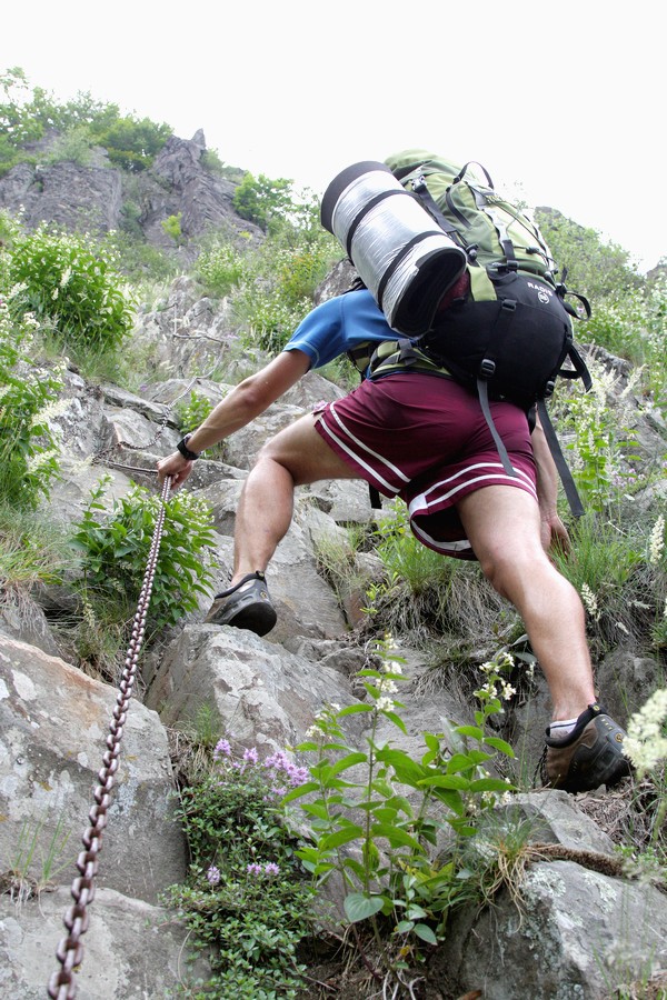 Pár údajov sa mi v hlave mieša z článkov, ktoré som dávnejšie čítala o prístupe k reťaziam. Všetky mali spoločné len to, že ich autori to zobrali každý inou cestou a každý pri tom blúdil. Nám sa ako najjednoduchší zdá nástup z námestia v Handlovej po červenej k nemocnici, podlezieme železničnú trať a za ňou odbočíme zo značky smerom doľava. Prejdeme popri Bani Handlová, kde sa cesta znovu rozdvojuje a opäť berieme ľavý variant. Odtiaľto sa asfaltka hadí popri skládke, cez lúky, Veľký Grič máme stále pred sebou. V jednom mieste sa doľava odpája nenápadná panelka - tu treba odbočiť! Tá vás potom dovedie na veľkú lúku, odkiaľ údajne už všetky chodníčky vedú pod lezecké skaly. My však odbočku ignorantsky prejdeme a šliapeme asfaltkou až k triedičke odpadov. Už sa nám nechce vracať a tak začíname prudko improvizovať. Skúšame to najprv lesnou cestou, ale keď sa táto otočí opačným smerom, vhupneme len tak naverímboha do lesa. Snažíme sa držať smer, predieranie nemá konca-kraja, všade húštiny, žihľava, komáre a kliešte. Hlavne tie posledne menované božie stvorenia nám neskutočne pijú krv. Každých pár metrov ich zo seba striasame alebo vyťahujeme desiatky. Napriek všetkým útrapám však nakoniec natrafíme na náznak chodníka, ktorý je čoraz zreteľnejší a postupne objavujeme aj biele šípky na stromoch. Tie nás už pekne navedú cez skalné more strmým stúpaním opäť do lesa. Aj tu sa chodník niekoľkokrát vetví kvôli prístupu k lezeckým cestám. Treba sa však držať vpravo a popri skalách, obsypaných názvami a obtiažnosťami sa dostávame konečne k hľadaným reťaziam.