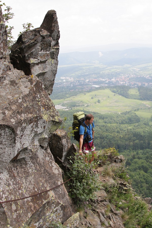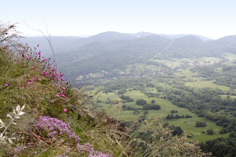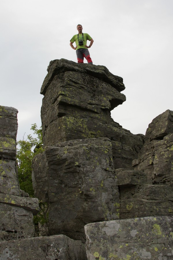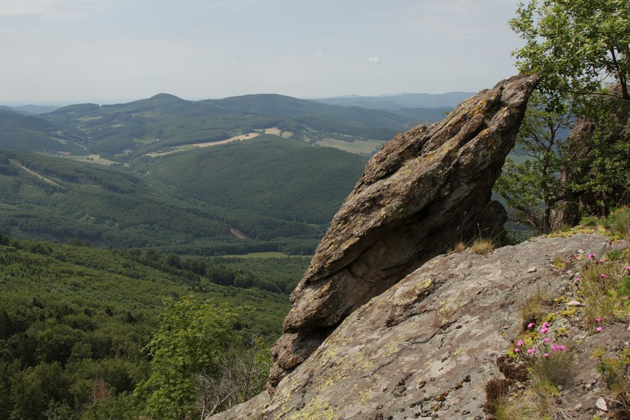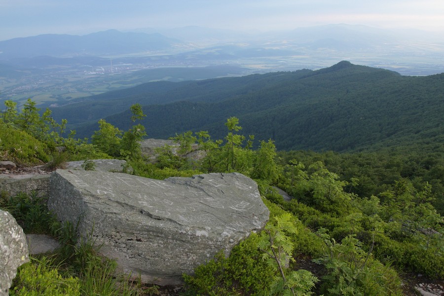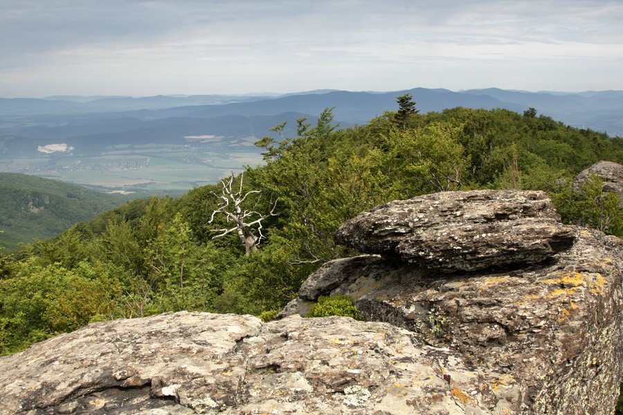 Ráno sa budím už pri prvých náznakoch svetla. Beriem foťák, možno cez tie mraky niečo preblysne. Slnko sa derie kdesi spoza Kriváňa (správne, vidieť až do Tatier!), ale ukáže sa len na krátko. Aj kopce sa pomaly zahaľujú do oblakov. Tak teda balíme bejvák a ideme ďalej. Na Kláštorskej skale stretávame ďalších dvoch dobrodruhov, ktorí tu spali. Trochu popoliezame po skalách a pri prvých dažďových kvapkách prášime preč. Už zo zimného prechodu viem, že po Rúbaný vrch je to dosť nezáživné a monotónne pochodovanie lesom. Našťastie aj dážď len postrašil a cesta ubieha rýchlo. Z Rúbaného vrchu bočíme na žltú. Ešte to nepoznáme, ale podľa mapy má trasa pekný skalný potenciál s vyhliadkovými bodmi. Predpoklad nesklamal a už čoskoro sa začínajú v lese objavovať roztrúsené skaliská. Čerešničkou na torte je Buchlov, kde sa dá po rebríkoch a za pomoci 4x4 vydriapať až na samý skalný vrchol. Hore na nás čaká klasický dvojkríž a kruhový výhľad. Ani ďalšie scenérie na trase nezaostávajú atraktivitou. Cestou dole si doprajeme krátku zachádzku k chránenému jaseňu pod Buchlovom. Jeho obvod 634cm, výška 30m a vek 250 rokov hovoria za všetko. Smerom k Žarnovu vedie chodník stále lesom, no vždy je čo obzerať - skalné galérie, fotogenický bukový les, tráva vlniaca sa vo vetre... Veď to! Tá tráva! Chuť váľať sa v nej ma rýchlo opúšťa. Je opäť plná kliešťov. Za pár okamihov ma prechádza aj chuť na fotenie, nikde už radšej nezastavujeme, len podchvíľou zo seba striasame otravné zvieratká. Vyzerá to skôr ako panický útek z lesa, než pohodová túra. V sedle pod Žarnovom máme sto chutí na vrchol sa vykašlať. Našťastie ten kúsok morálky nám ešte ostal. Spod dvojkríža na Žarnove je dobrý výhľad na Hornú Nitru a začiatkom leta to tu celkom pekne kvitne. Oplatí sa zájsť.