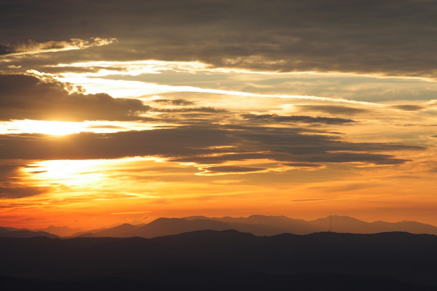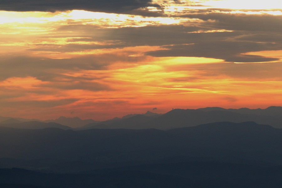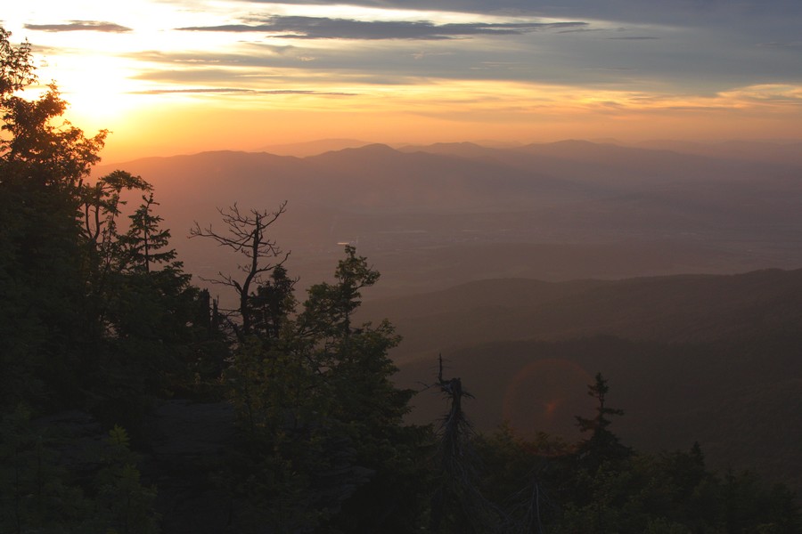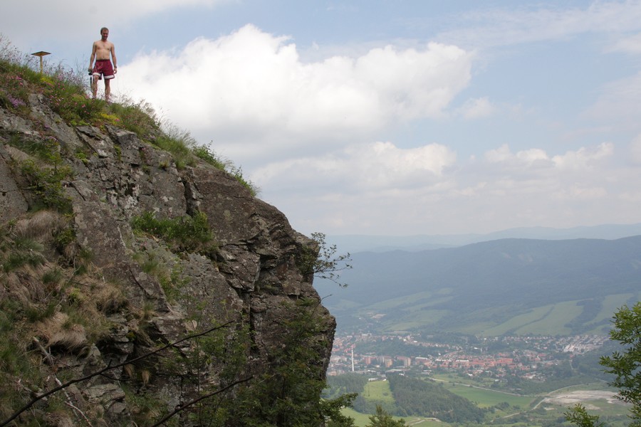 Výhľady z "ferraty" aj z Griča sú len do Handlovskej kotliny, ďalej by sme kvôli silnému oparu aj tak nedovideli. Dávame obednú prestávku a mierne optimalizujeme bivakový plán. Namiesto Rúbaného vrchu to zapichneme už na Vtáčniku. Tým pádom nastáva veget. Chodník sa hadí lesom bez výraznejšieho stúpania či klesania, bez výhľadov, stále po zvážnici. Celkovú nezáživnosť spestrí len vysielač na Jarabej skale a výdatný prameň Kanie studne. V letnej horúčave máme sto chutí vyváľať sa tam celí. Na Vtáčnik dorážame relatívne skoro, ale ďalej sa nám fakt nechce. Zabíjame čas povaľovaním sa po skalách, fotením, maškrtením (nie, nikto ma neškrtil!), postupne vyprevádzame posledných turistov, až nakoniec ostávame sami. Ustelieme si, trochu hygieny tiež nezaškodí, obliekame negližé a až do zotmenia sledujeme skon ďalšieho dňa. Takúto romantiku môžem :o)