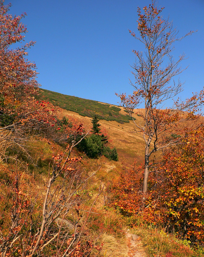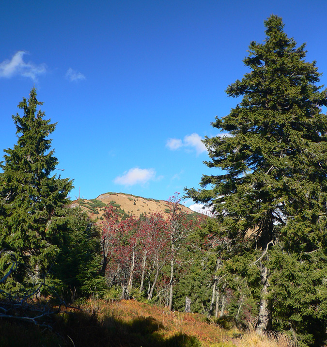 Hore na chate už sa rozbieha nedeľný ruch. Nemám síce „zpoždění“, ale aj tak nezastavujem, pokračujem do strakatej hory v traverze Kľačianskej Magury. To bude predkrm k hlavnému chodu - traverzu jej vyššieho suseda Suchého. Mierim len pod hrebeň, na Suchý ma to dnes neťahá. Som tam dosť často a v takomto počasí ma skôr oslovuje farebná paleta na jeho svahoch ako výhľady z jeho vrcholu. V sedle pod Suchým chvíľu váham: doprava či doľava? Žltá ako žltá, ale kade to bude najvďačnejšie vzhľadom na dráhu slnka po oblohe? Nakoniec začínam smerom na východ, do sedla Priehyb, v ústrety Malému Kriváňu.