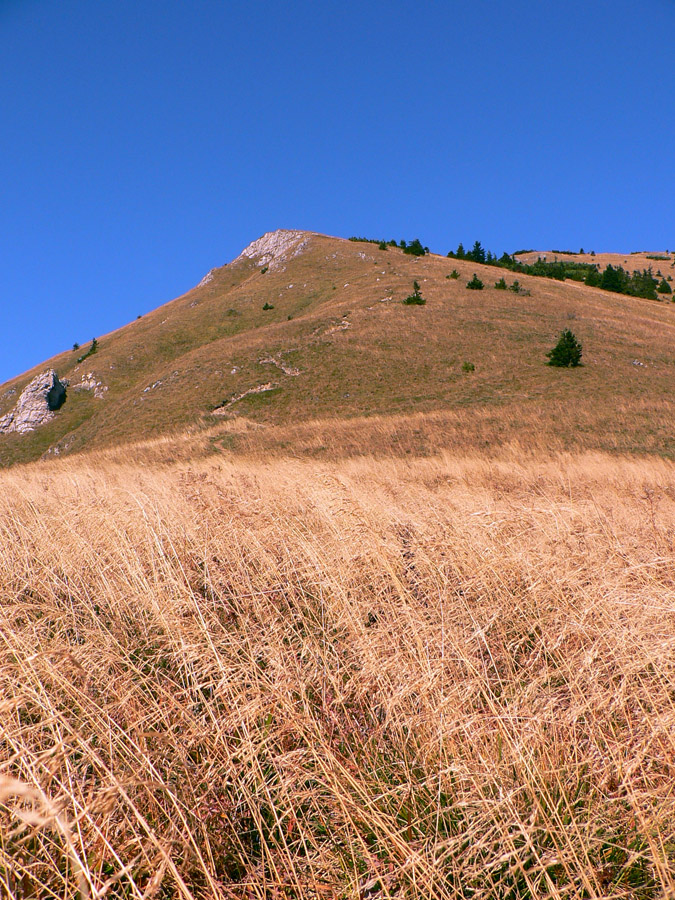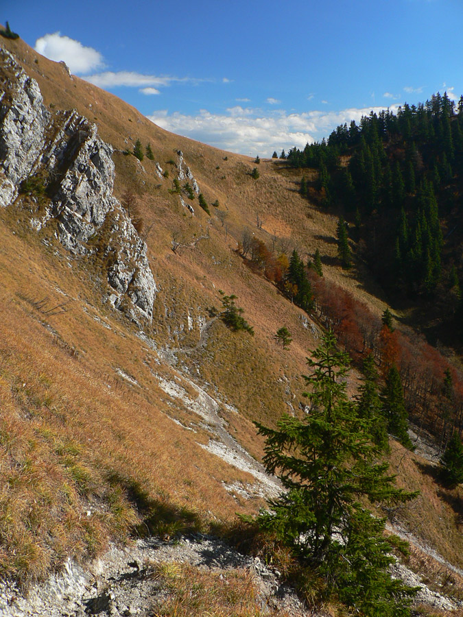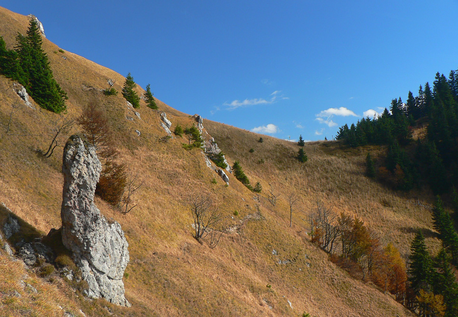 Na teplých trávnatých svahoch sa v južnom vetre trepocú suché trávy maslovej farby, z nich trčia posledné tohtoročné horce - pahorce a páriky lúčnych koníkov sa ešte pokúšajú o potomstvo. Nad tými zvyškami jesenného tepla hrdzavejú koruny bukových remízok a úplne hore svietia biele vápencové steny Bielych skál a Stratenca. Medzi sedlami Priehyb a Vráta zas nasleduje kúsok hrebeňovej, kosodrevinovej turistiky s bohatými výhľadmi na strakatú Kysuckú vrchovinu, kde okrem zmiešaných lesných farieb aj hra svetla a tieňa z oblakov fragmentuje jednoliaty obraz na plôšky.