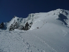 Po prelezení kľúčového miesta nasleduje najkrajší úsek. Veľmi pekné lezecké úseky (cca 3) až na vrchol. Prerušené je to druhým ľadovým poľom. Tu som mal prešľapanú stopu, bola dobrá a tak som mačky opäť nepoužil. Všimol som si že ľudia, ktorých som predbiehal, mačky nasadzovali, takže treba s tým rátať.