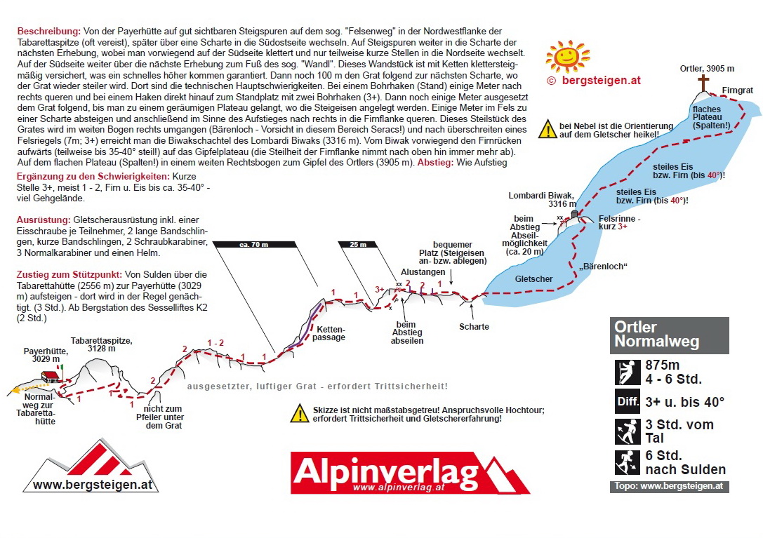 Heini Holzer kedysi napísal o Ortleri, ktorý bol jeho častým cieľom: "Výstup na Ortler mi trval vždy maximálne 4 hodiny, nech som išiel ktoroukoľvek výstupovou trasou." Na mysli mal samozrejme výstup zo Suldenu a nie z niektorej z chát. Na nete som sa dočítal, ako ľudia po výstupe cez Hintergrat museli bivakovať v bivaku Lombardi, lebo boli moc pomalí...