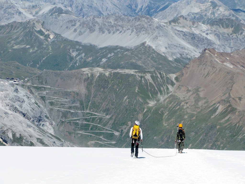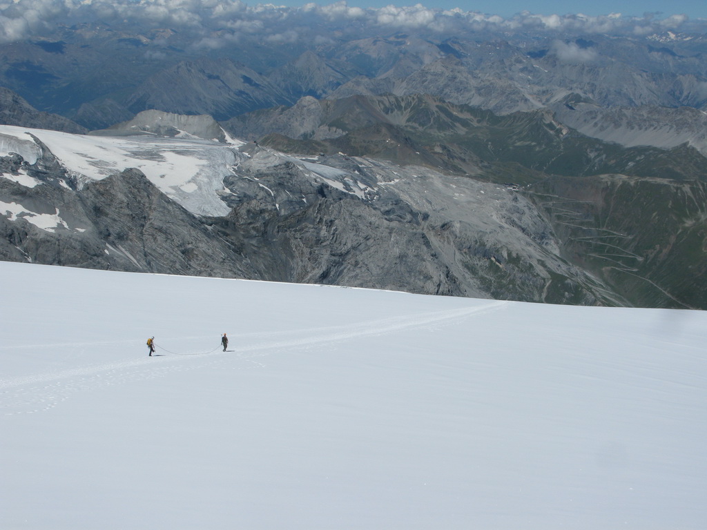 Počas mojich dvoch výletov na Ortler som sa našťastie s týmto problémom nestretol. Po výstupe Hintergratom som pri zostupe po ľadovci dokonca využil ponuku dvoch Rakúšanov a cez trhliny som prešiel spolu s nimi, naviazaný na lane. Takže som nemusel vôbec riskovať.
