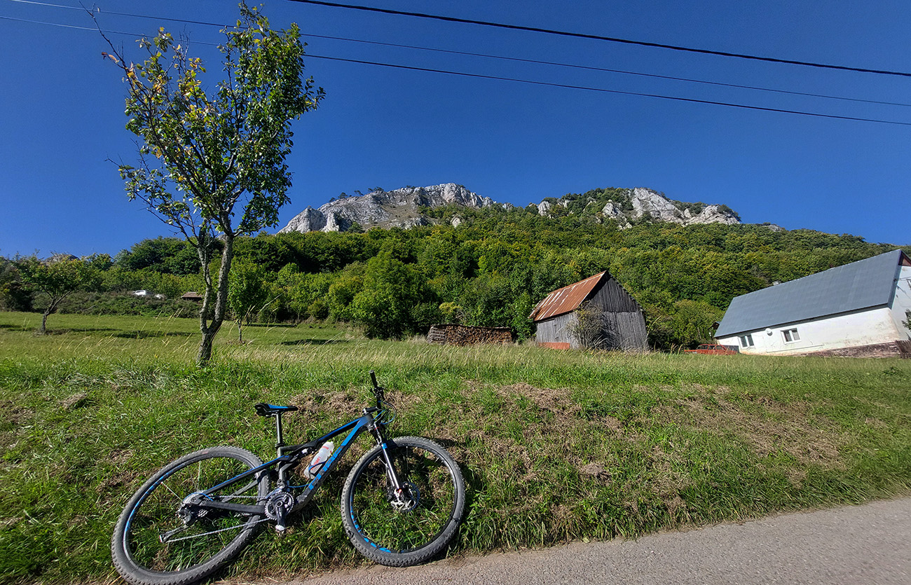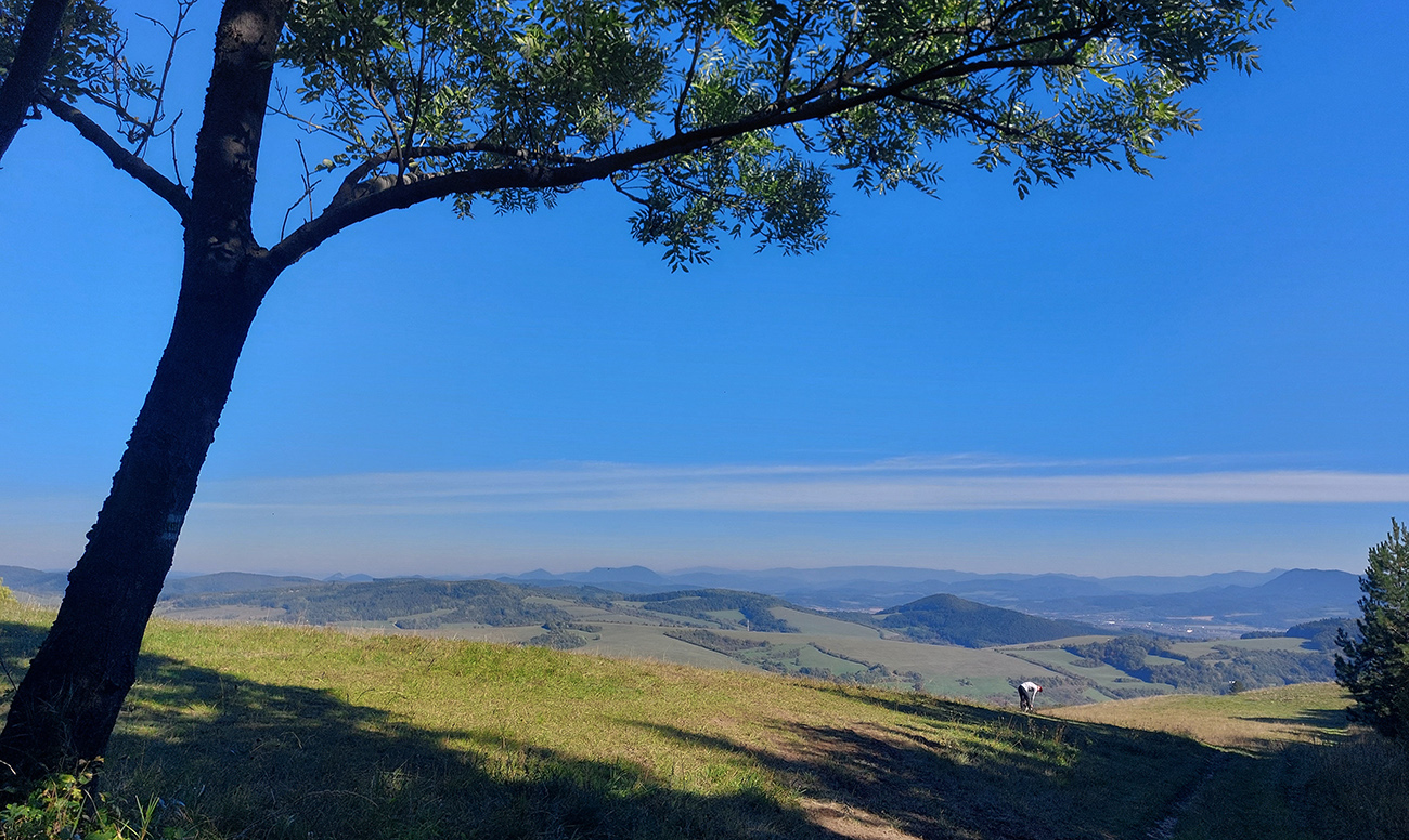 Pod Vršatskými bradlami plno, autoturistika poriadna, len som sa pokochal skalami a panorámou kotliny na východe. A davaj dole, do poslednej „etapy“. Tou bol dlhý a miestami strmý zjazd zo sedla Chotuč do Pruského (zelená značka). Opačne by som to teda ísť nechcel. Na bajku, pešo by to bola príjemná prechádzka. Zas početné výhľady, tým na sever a východ už slnko nevadilo.