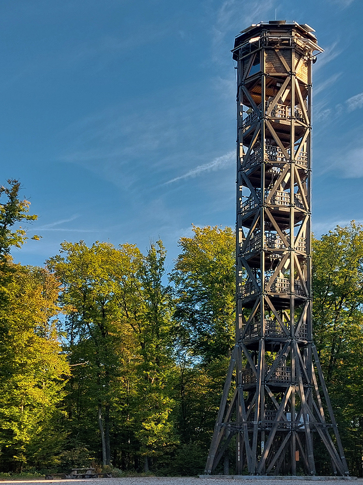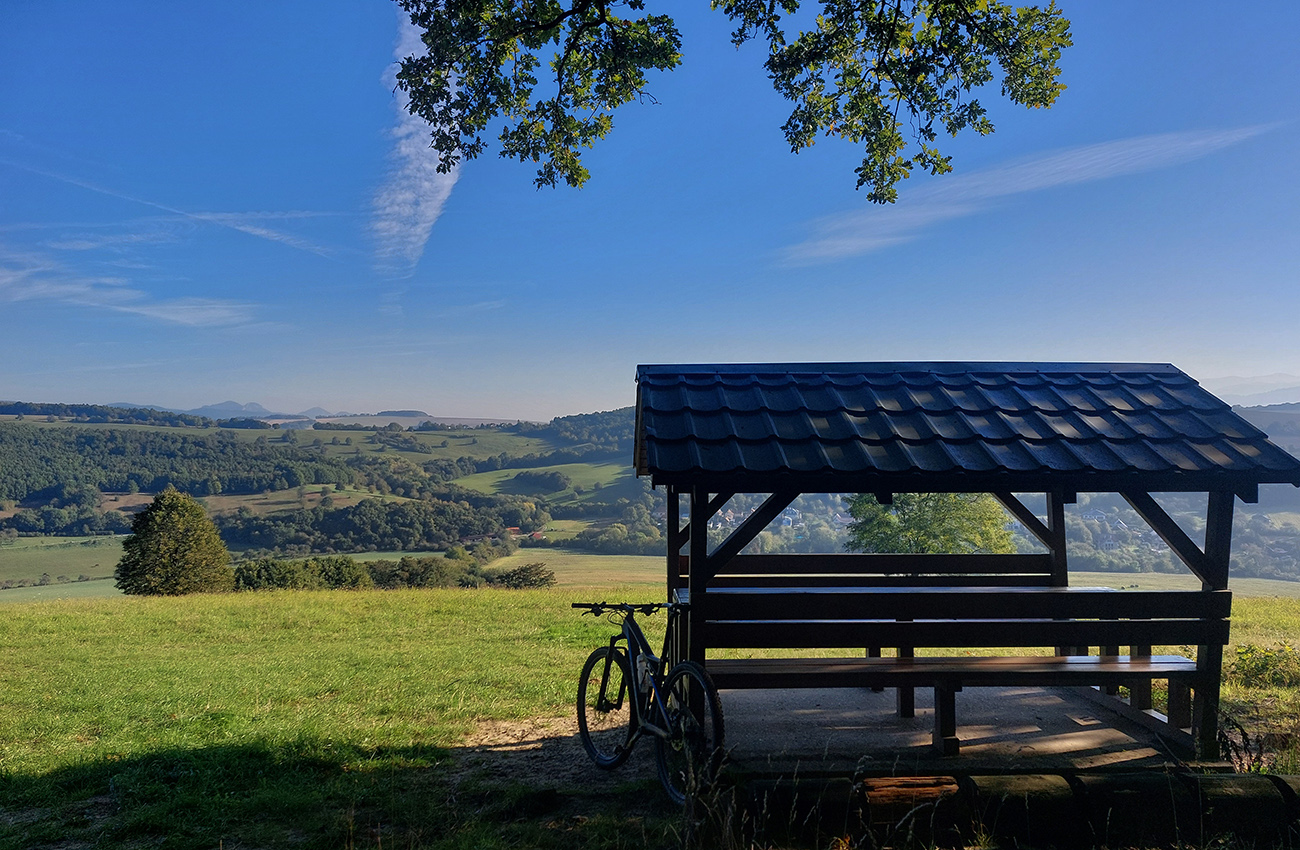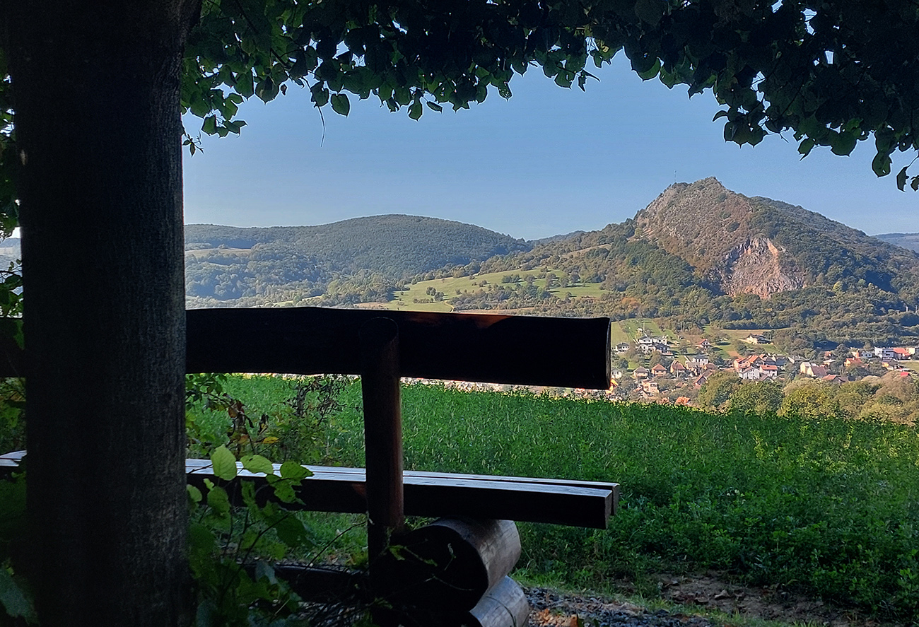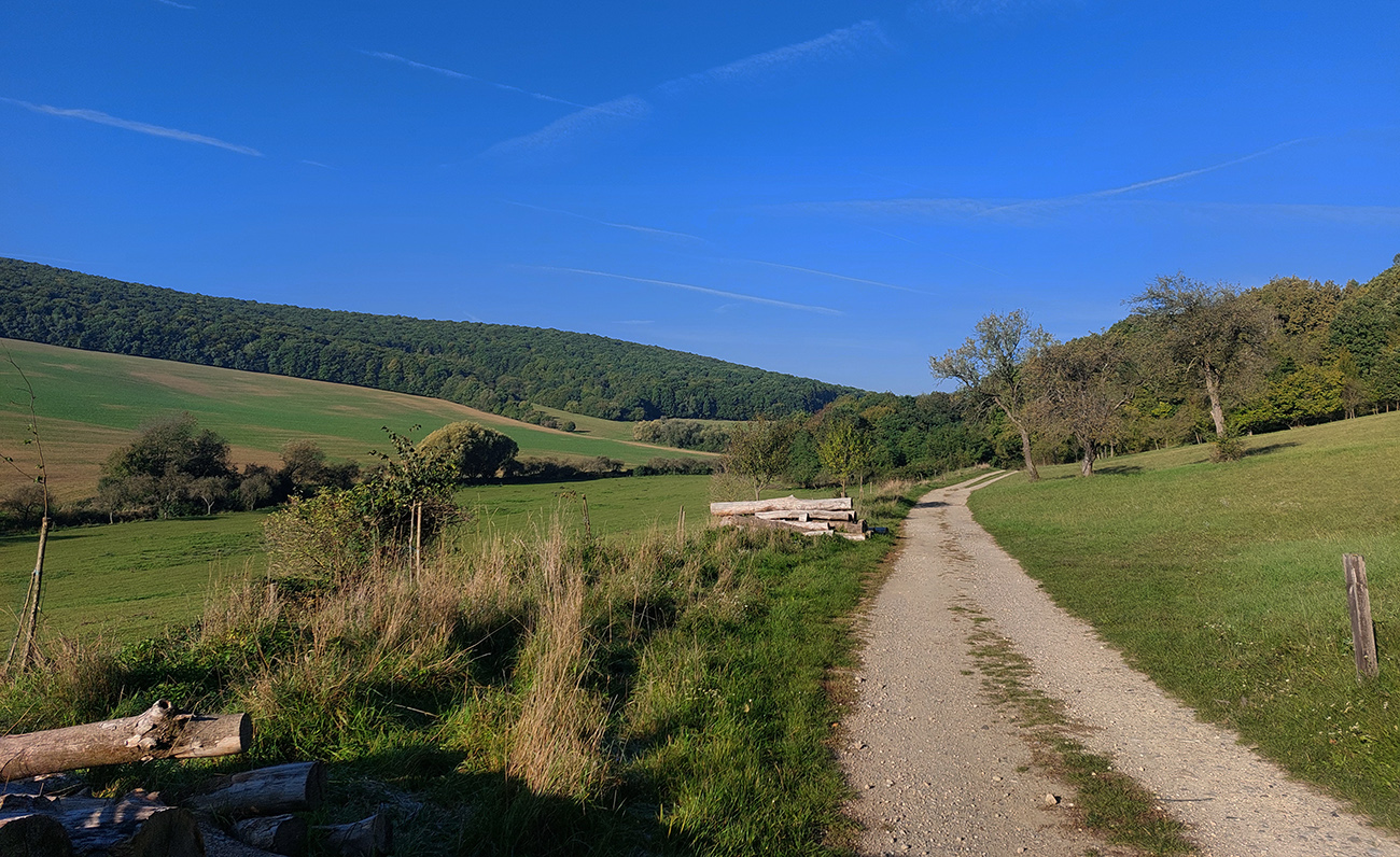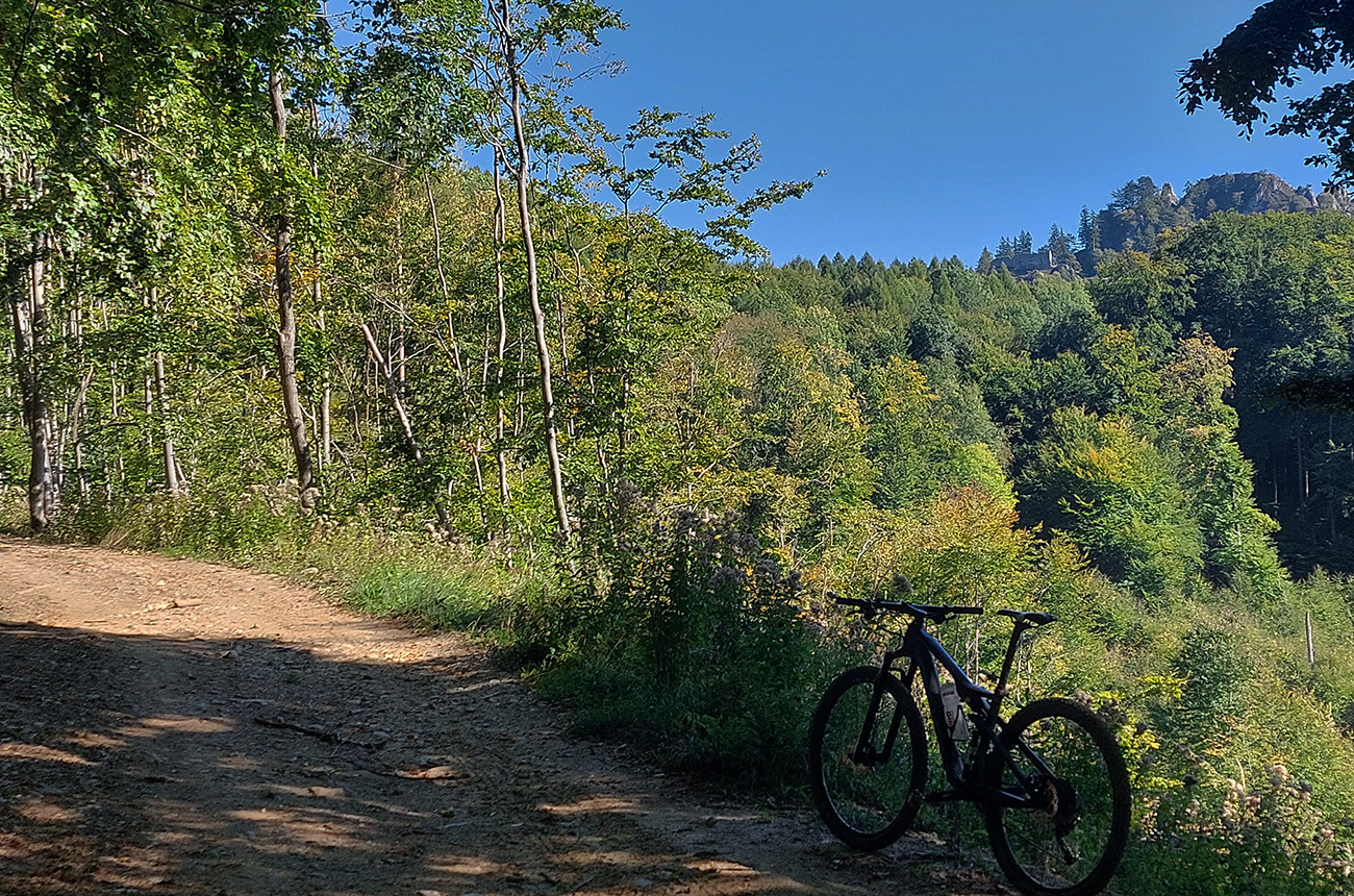 V prvej časti, až niekam za Horné Srnie, to bolo časté striedanie výhľadových lúk a pasienkov s hlinenými cestami krížom cez listnaté lesy. Zopár menej pohodlných, lebo strmých výšľapov, ale nie dlhých, zvládnuteľných. Inak pohodové sklony, takmer všade široké cesty, aj asfalt, kde by som ho možno nečakal. No a to sucho - po septembrových dažďoch až zarážajúce. Cestou dve rozhľadne a prejazd popod bralnatý Krasín nad Dolnou Súčou.