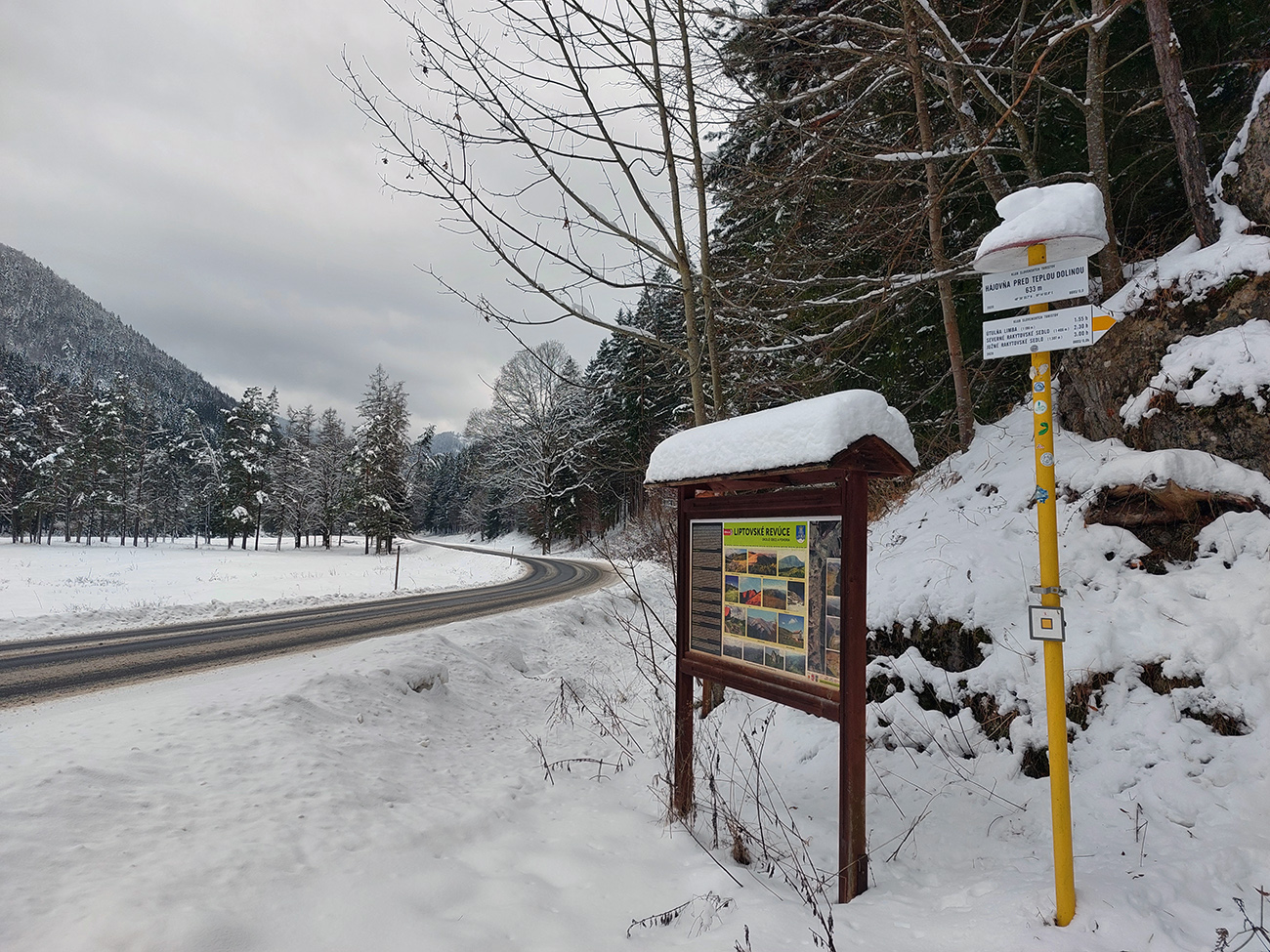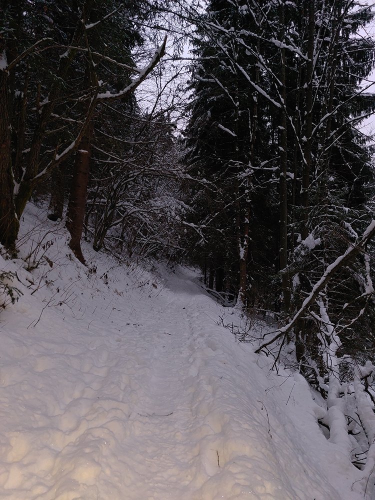 Prvá improvizácia hneď na chodníku do Hrabova: normálne by sa to dalo na pásoch, aj v lese snehu dosť a pekne utlačeného. Skoro nič netrčalo, aj tie prechody cez pramienky vysnežené – takto začiatkom zimy som to ešte nezažil, dobre to začína! Ale keď už boli lyže na batohu, neriešil som, aj tak bude treba prenášať cez parkovisko. Len som si zafixoval, že ak by som cestou nazad náhodou nestíhal ku vlaku, môžem sa tu zrýchliť.