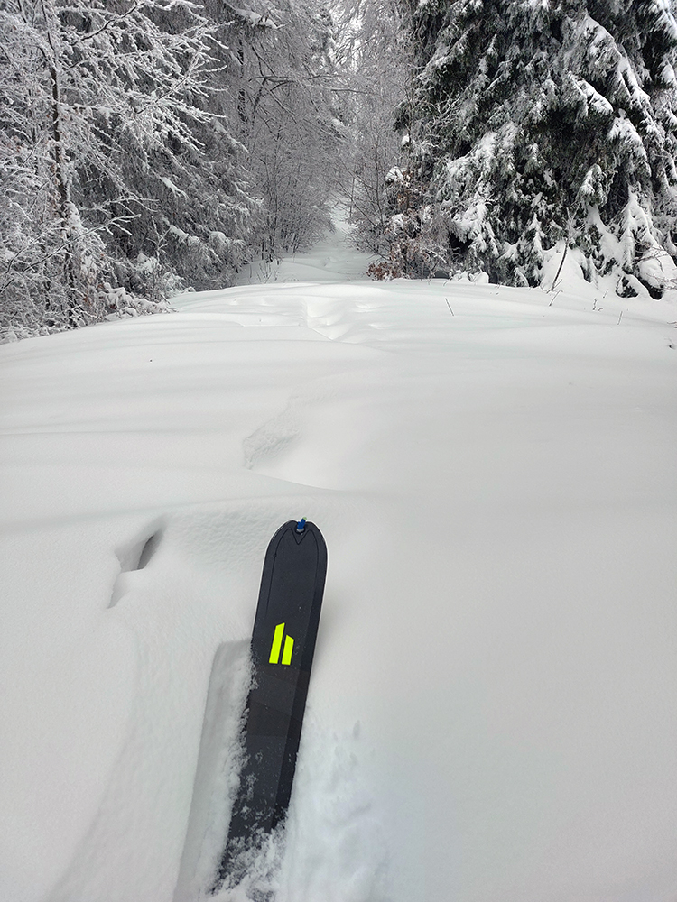 Pri lanovke ceduľa, že zákaz vstupu na zjazdovku, chodia tam ratraky. No, za rannej polotmy ešte nechodili, ale zúrivo tam syčali delá, rešpektoval som – a teda nastala ďalšia improvizácia: direkt hore popod lanovku, na Medvediu cestu. Už na pásoch, stopa komfortná, ale na cestu dole to práve tu nebude. To bude treba zbehnúť po svojich, pomedzi to všetko, čo okolo trčí spod snehu.