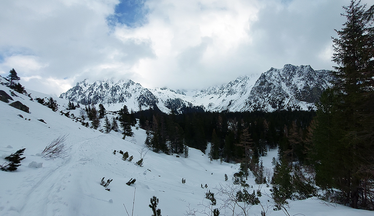 Táto superteplá zima núti ísť za snehom stále vyššie, ale stále sa dá nájsť aj ten dobrý. Tatry sú záchrana a teraz po prepršanom piatku a čiastočne aj sobote (aj vo výške Štrbského plesa) prišla jasná noc, tak sme ráno naskakovali do lyží pod Triganom (smer Popradské pleso) na betónový, viac hnedý ako biely, a poriadne hlučný podklad. Ale stále sa dá od smerovníka pri ceste. Zimný chodník (najmä zjazdík spod Triganu) ľadový, utrpenie pre pásy. Kúsok po ceste na Popradské ples – čistý ľad. Rachot spod lyží sa začal konečne zmierňovať až pri stúpaní lesom do Mengusovskej. A začali sa otvárať aj pohľady na čerstvé a poriadne veľké splazy až malé lavínky pod Patriou. Ktoré sa ale nedoplazili až na letný chodník, tak vyzeral byť bezpečný. Čo mohlo a malo, hádam už spadlo: