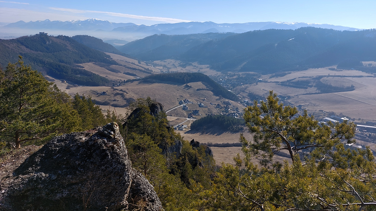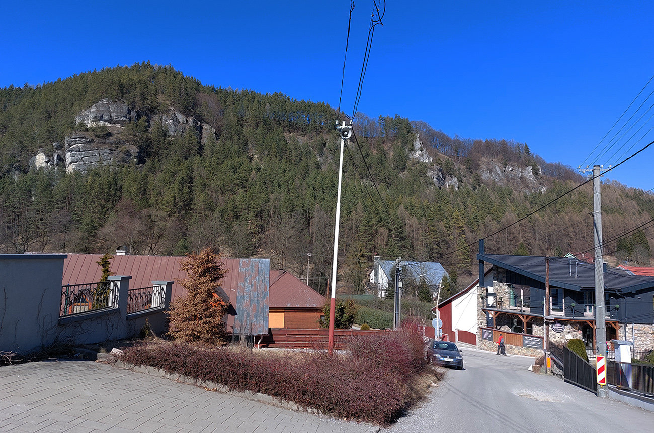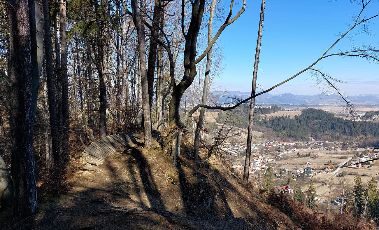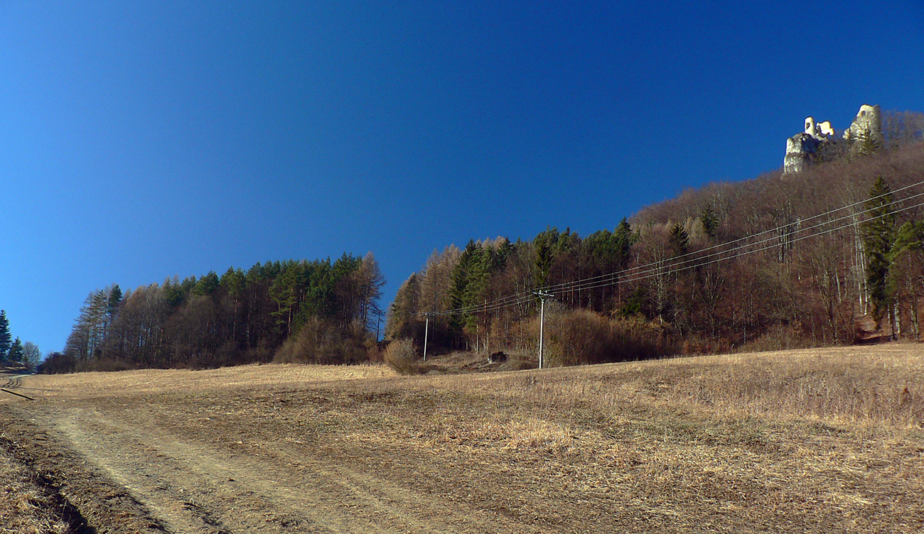 No a aby som sa dole k autobusu nevracal rovnako, z hradu som sa do Lietavy zošuchol po príjemnom chodníku, ktorý vedie priamo spod jeho severných hradieb. Zas iné pohľady na jeho majestát, aj keď som ich mal proti slnku. Hrebienky na sever sú dva, ale dedinu dole počuť aj vidieť, zablúdiť sa nedá, len o kúsok inde prísť :-) Treba proste ísť viac doprava, trochu navádzajú aj zvyšky nejakej miestnej bajkovej trate. Skoré predjarie je inak na túto prechádzku super, lebo pomedzi holé stromy dobre vidno tie skalné steny a veže. Kto chce, hore má aj gpx – šťastnú cestu!