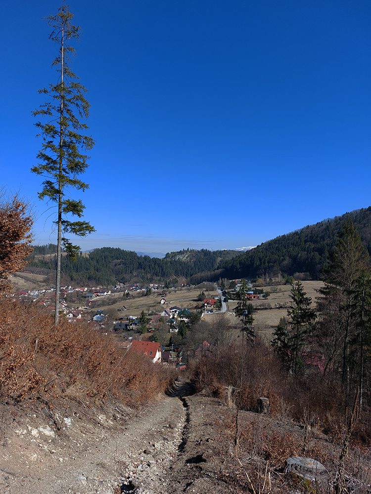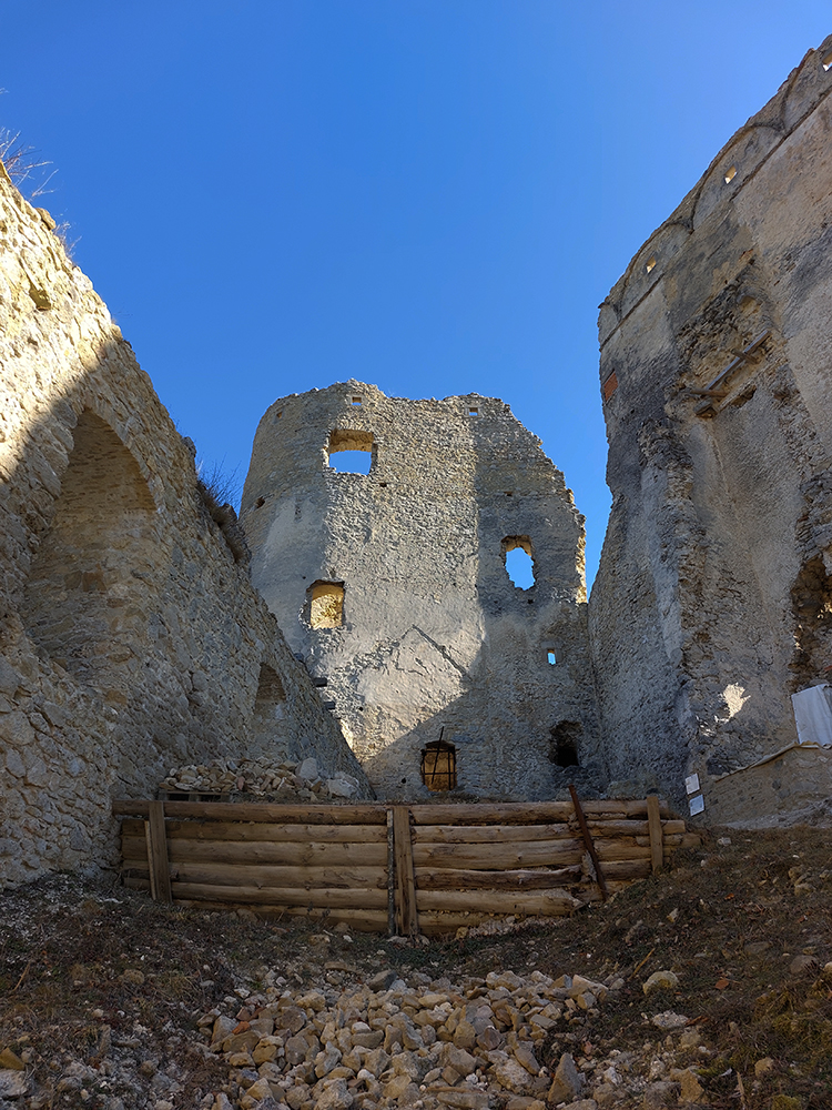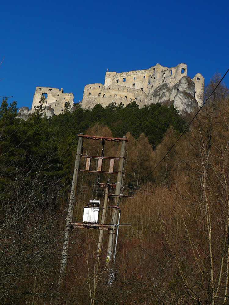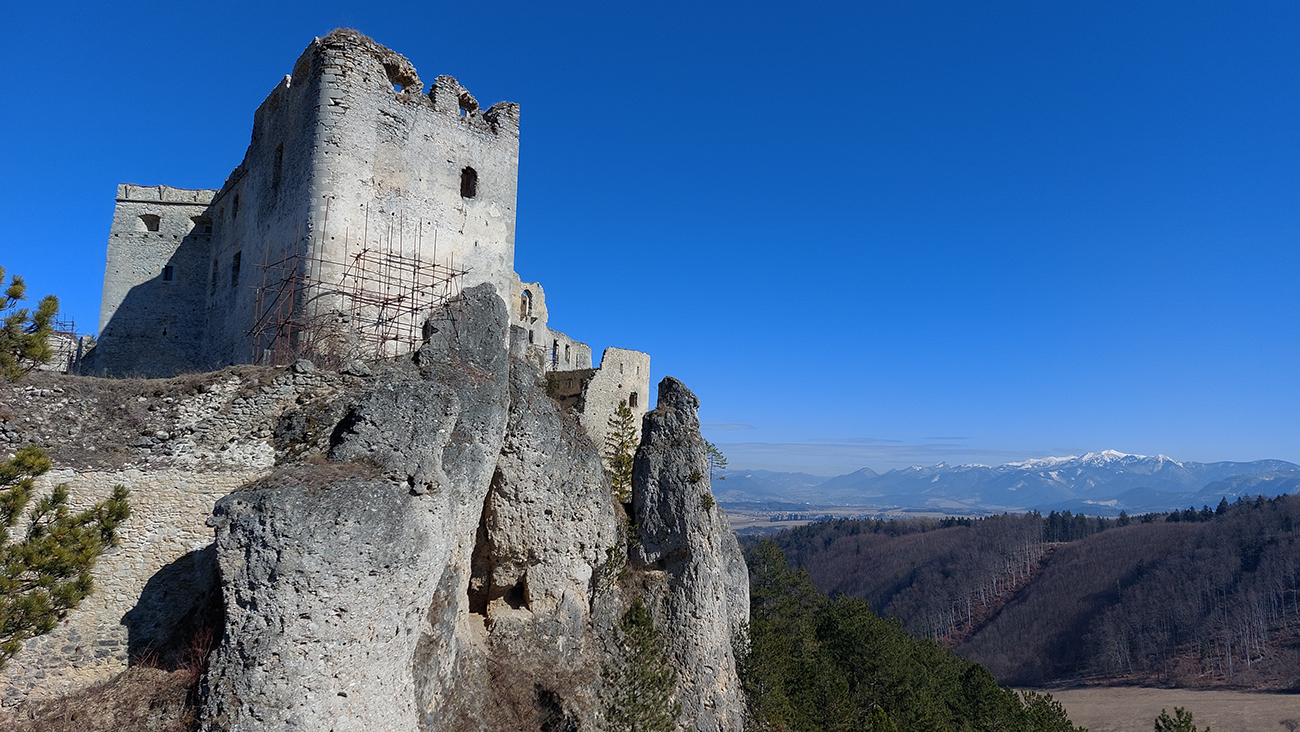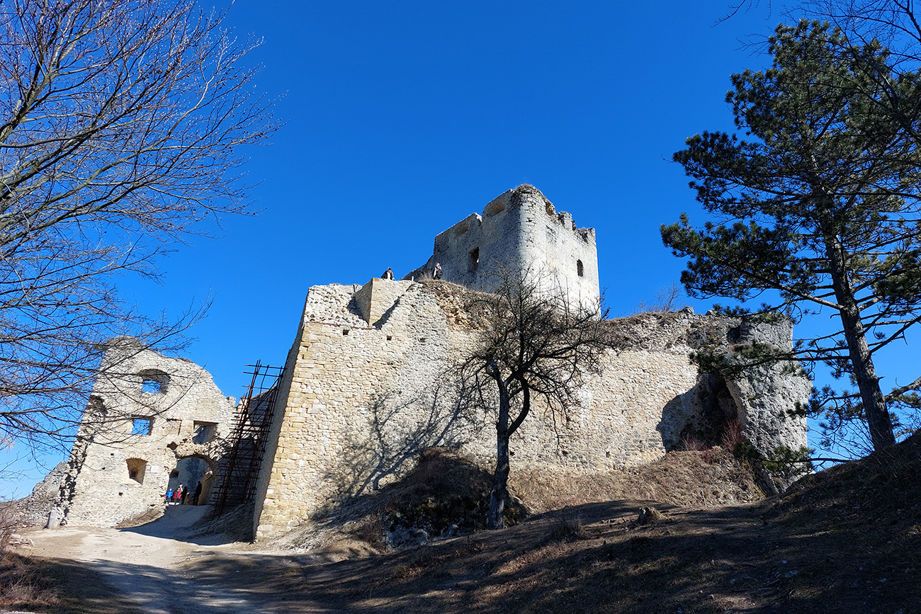No a aby som sa dole k autobusu nevracal rovnako, z hradu som sa do Lietavy zošuchol po príjemnom chodníku, ktorý vedie priamo spod jeho severných hradieb. Zas iné pohľady na jeho majestát, aj keď som ich mal proti slnku. Hrebienky na sever sú dva, ale dedinu dole počuť aj vidieť, zablúdiť sa nedá, len o kúsok inde prísť :-) Treba proste ísť viac doprava, trochu navádzajú aj zvyšky nejakej miestnej bajkovej trate. Skoré predjarie je inak na túto prechádzku super, lebo pomedzi holé stromy dobre vidno tie skalné steny a veže. Kto chce, hore má aj gpx – šťastnú cestu!