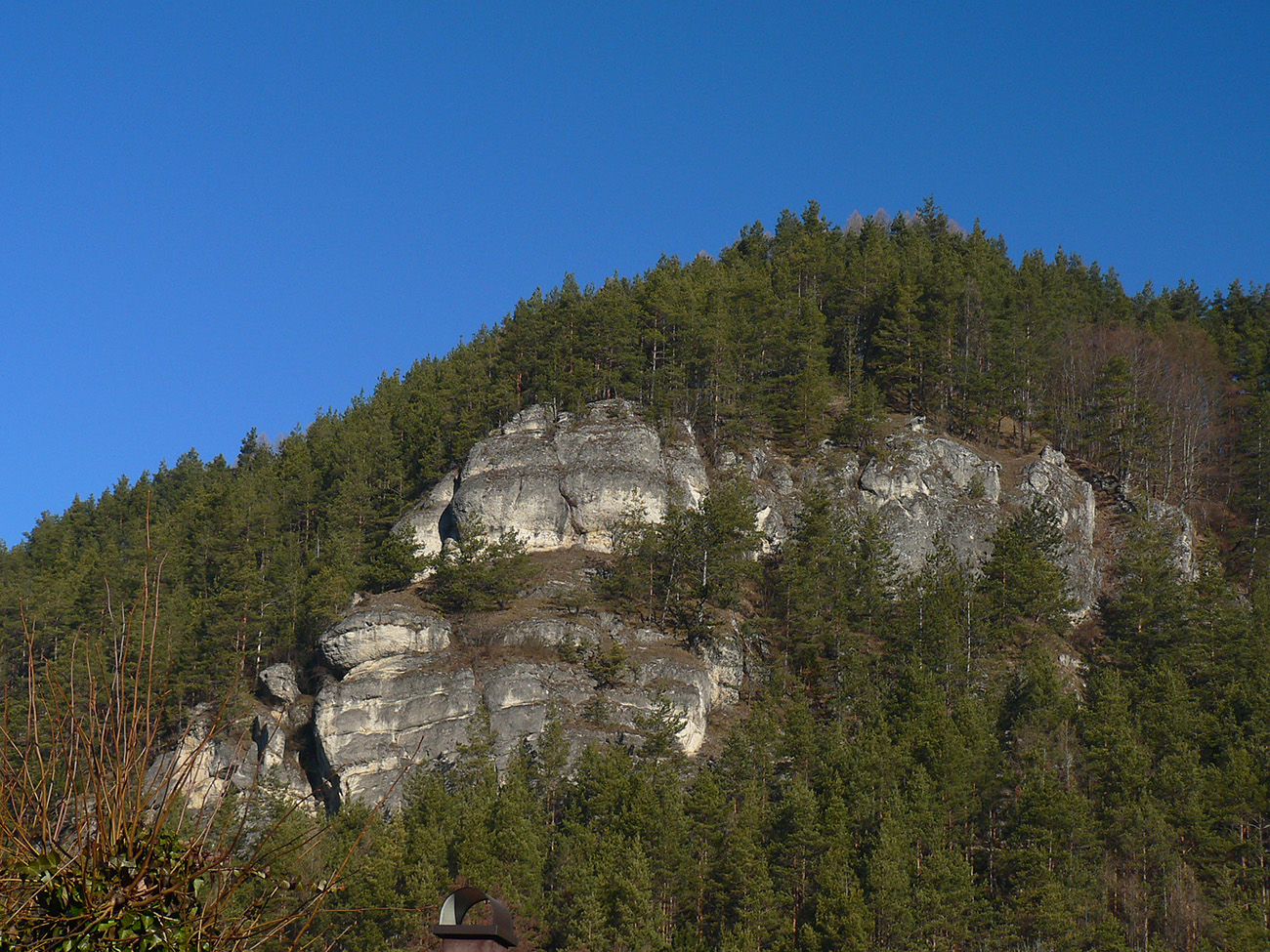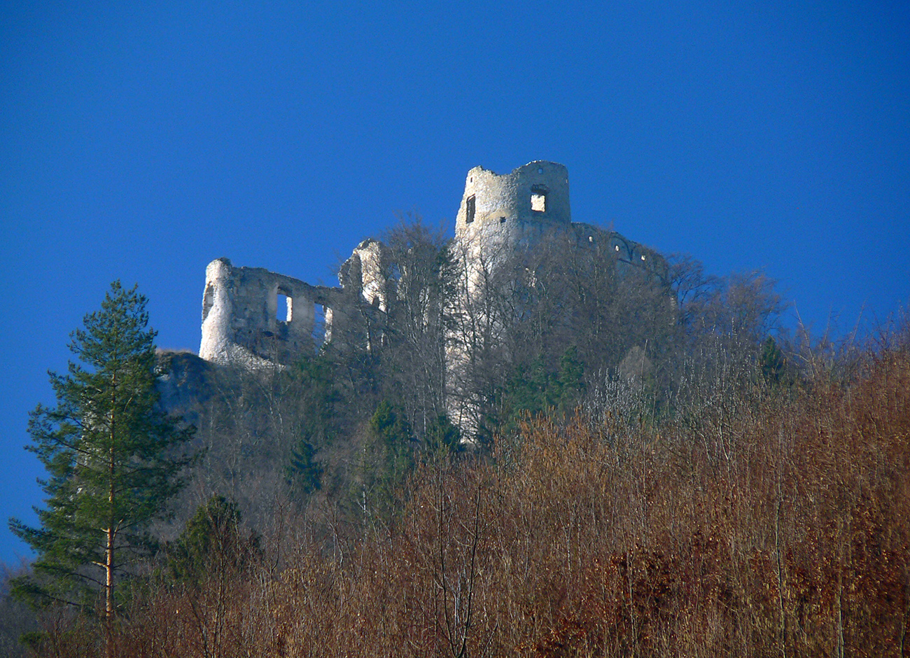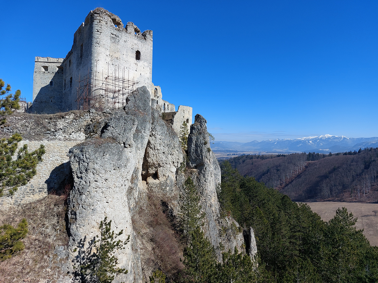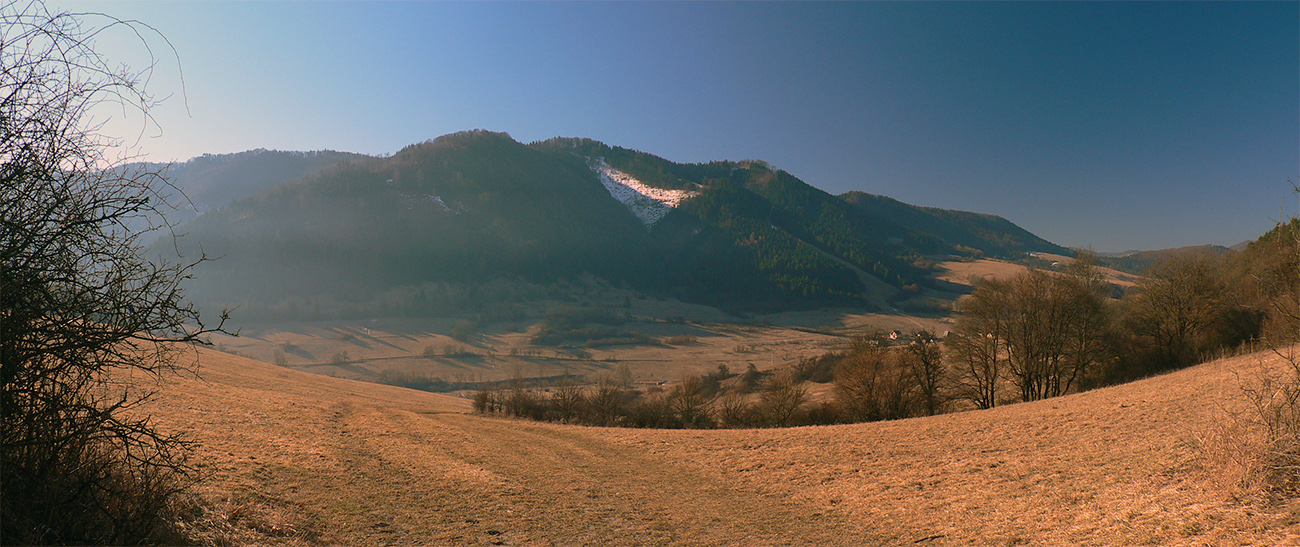 No a aby som sa dole k autobusu nevracal rovnako, z hradu som sa do Lietavy zošuchol po príjemnom chodníku, ktorý vedie priamo spod jeho severných hradieb. Zas iné pohľady na jeho majestát, aj keď som ich mal proti slnku. Hrebienky na sever sú dva, ale dedinu dole počuť aj vidieť, zablúdiť sa nedá, len o kúsok inde prísť :-) Treba proste ísť viac doprava, trochu navádzajú aj zvyšky nejakej miestnej bajkovej trate. Skoré predjarie je inak na túto prechádzku super, lebo pomedzi holé stromy dobre vidno tie skalné steny a veže. Kto chce, hore má aj gpx – šťastnú cestu!