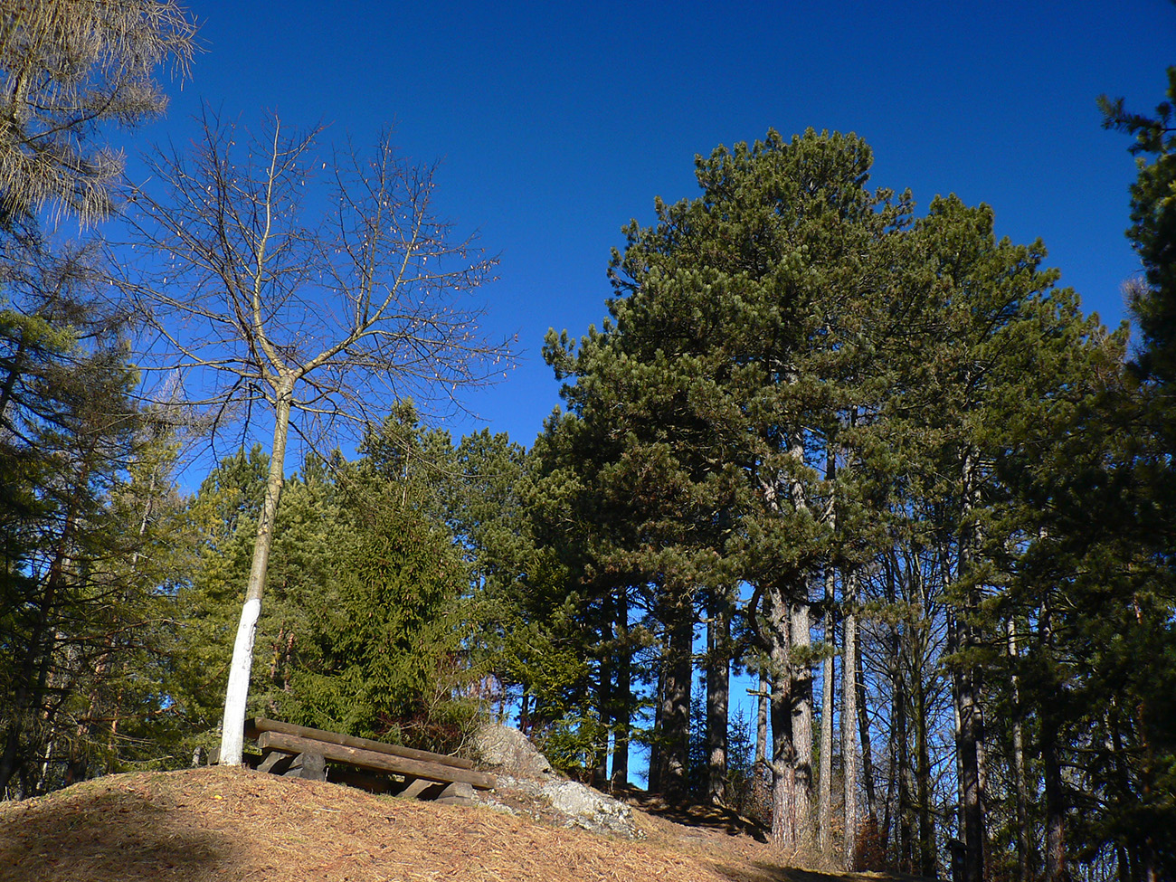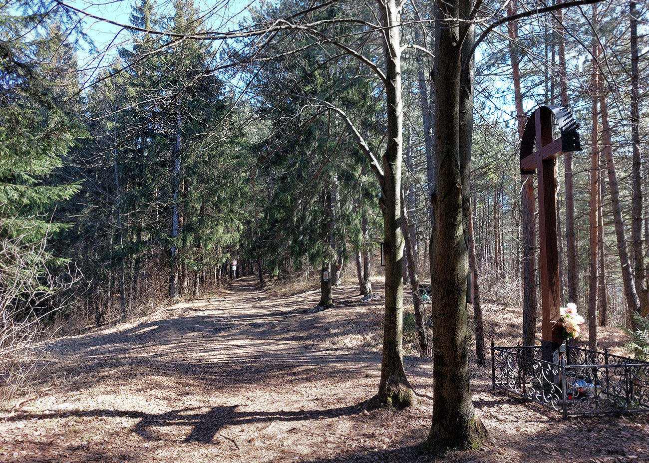 Značku som opustil v zalesnenom sedielku pri kríži, kde sa stretá až osem ciest a chodníkov. Neznačený, ale zreteľný chodník (niekedy aj viac chodníkov) vedie odtiaľ cez hrebienok Strážnej. Hneď na úvod pekná skalná plošina aj s výhľadom nazad ku hradu, potom čím ďalej, tým viac skaliek a výhľadov z vrcholov skalných veží.