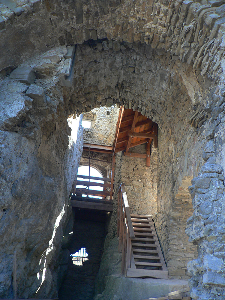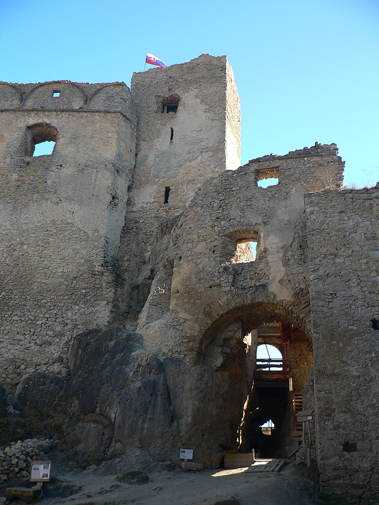 Nazad pod hrad som potom došiel takmer tou istou trasou, len som sa ešte popod skaly prvej vyhliadky pomotal. Hrad je impozantný z každej strany, kvalitne postavili tú zrúcaninu :-) A prístup k nemu po hrane poriadne vysokej skalnej steny (po odbočení z chodníka v závere) je fakt paráda! Potom už nasleduje prehliadka múrov, veží a nádvorí (alebo aj ponuky hradnej krčmy) – teóriu si ale záujemca nájde na lepších miestach. Tu len spomeniem, že stavitelia ozaj umne využili danosti terénu a miestneho zlepenca, podobného na pohľad betónu. Podobne ako na menšom Súľovskom hrade.