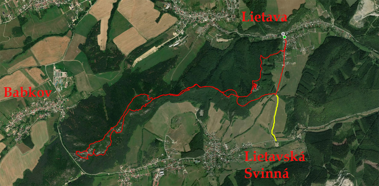Kto si chce užiť historické a prírodné pozoruhodnosti Súľovských skál v takmer rovnakej bombastickosti ako nad Súľovom a Hradnou, ale bez davov a v tichu, veľmi odporúčam túto prechádzku. Z Lietavy na samotný hrad je to (aj keď samozrejme pekne do kopca) len pár minút, ale celý ten hrebienok za hradom cez vrchol Strážnej (686 m) stojí za to. Vyrážal som po modrej z Lietavy (lebo bus), ale keď som sa tam okolo obeda vrátil, bolo malé parkovištiatko beznádejne preplnené a v okolí je trochu problém odstaviť auto, keby čosi. Možno lepšie pre motorizovaných by bolo začať v druhej doline, za kopcom v Lietavskej Svinnej, presnejšie od futbalového ihriska na dolnom konci. Tam je miesta viac, hrad vidno od začiatku a do sedielka pod lesom (čiže na modrú značku) vedie pohodlná cesta cez lúky. To je tá žltá čiara v mapke: