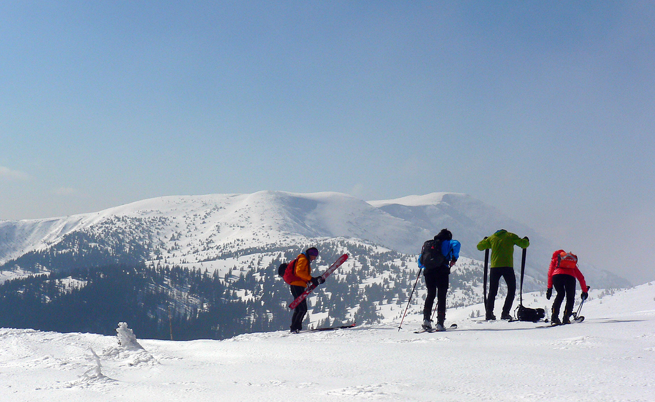 No mali sme byť traja, nakotilo sa nás päť. Na môj samotársky vkus poriadna banda, ale všetko známe firmy, niekedy neuškodí aj takáto „masofka“. Mal som tam byť za sprievodcu, ale známa firma „Majster Z“ sa vyzná lepšie, najmä po kadejakých miestnych zbojníckych chodníčkoch, grúňoch a dolinách. Tak som s radosťou prijal úlohu vzadu sa vlečúceho a miestami z predposledných síl nadbiehajúceho fotoreportéra. Lebo počasie vyšlo na jedna mínus. Jedna preto, lebo aj na hrebeni vládlo bezvetrie, slnko čoraz viac prepaľovalo rednúce mraky a dobré snehy sa dali nájsť ľahko. Mínus preto, lebo nepieklo ani na južných svahoch, slnkom opekaných, v podstate stále bolo mínus a keď už okolo obeda začal prašanček na tých juhoch trošíčka naznačovať, že by snáď mohol aj lepiť, zdrhli sme definitívne do severov.