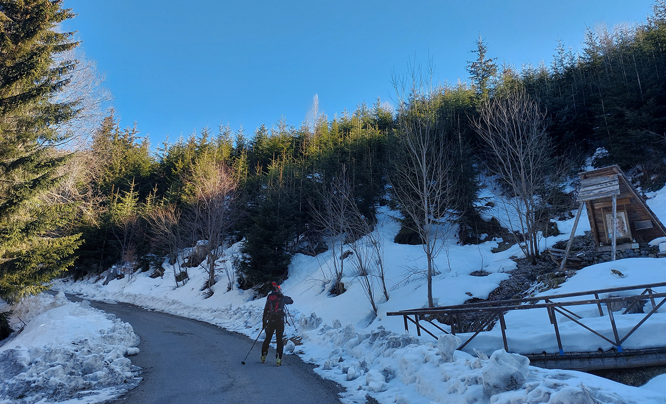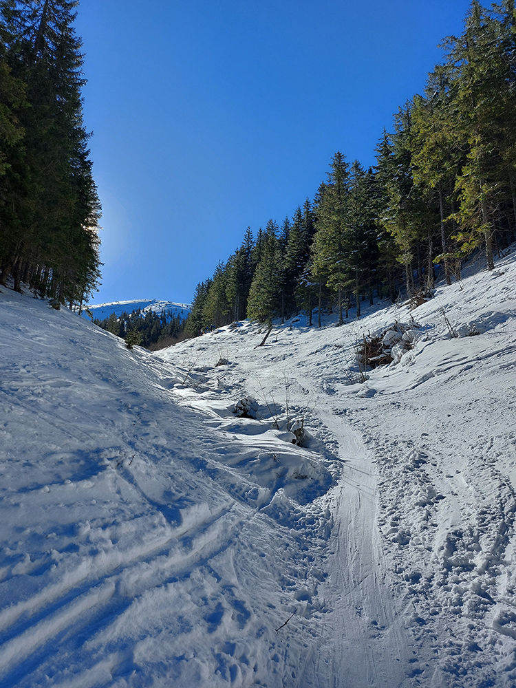 Nástup teda štýlový - cez kopu dreva, zapadanú snehom. Priamo cez potok asi. Ale sme proste nasledovali stopy. Viedenka zato parádne vyleštená, tvrdá, vôbec nie ľadovo šmykľavá. Aj rodinný výlet a pípajúci lavínový kurz sme minuli a bez podklzovania sme sa šťastne dostali až do kotla: