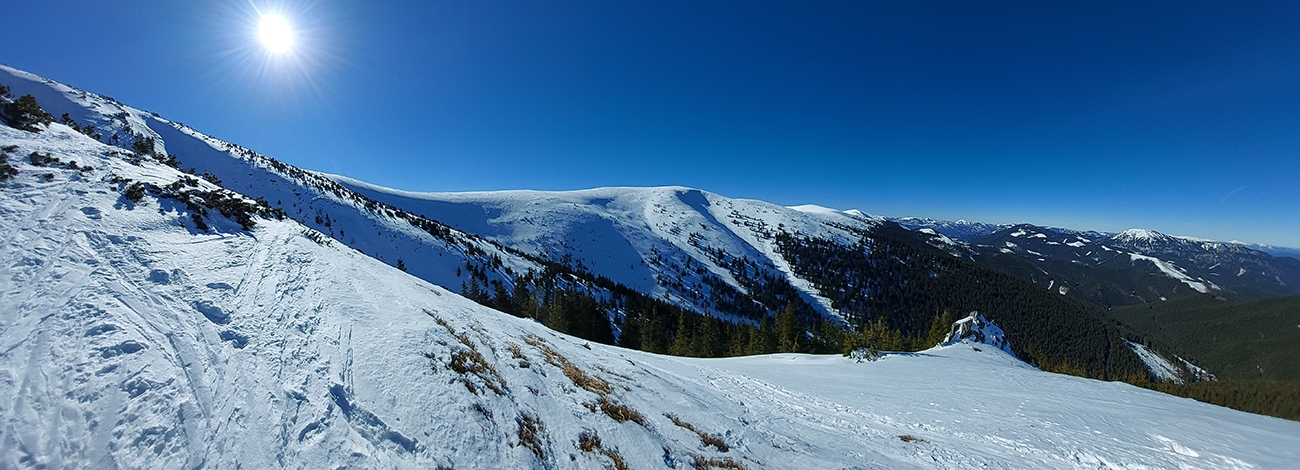 A tam samozrejme dilema, že kade hore. Zhodli sme sa napokon, že to vezmeme zľava a keď sa vyššie rozkukáme, uvidíme čo ďalej. Napokon sme to tam otočili dvakrát. Prvá jazda v parádnom prašane na tvrdom podklade, priamo do severu. Druhá trochu horšia o „zjazdovku“ vedľa, aj nejaké kôrky už za nohy ťahali, orientácia svahov už hrala podstatnú rolu. Ale slniečko sme videli po dlhej dobe konečne inak ako len cez okno pracovne, to bolo hlavné. A teplota ideál, aj vietor len osviežoval, nemrazil.