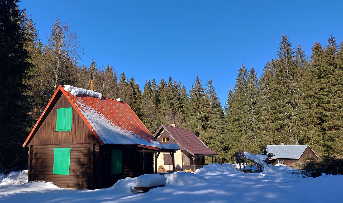 Ako sme minuli odparkovaný harvestor, cesta obelela, tak sme to skúsili na pásoch, ale o chvíľu išli lyže zase na chrbát, až po horný koniec Magurky. Aspoň sme si poobzerali odbočky a trochu hádali, ktorá z nich nás nazad na túto cestu vypľuje na konci. A potom sme si poobzerali domčeky a iné artefakty Magurky a „s piesňou na perách“ sme konečne nastúpili do lyží a do Viedenky.