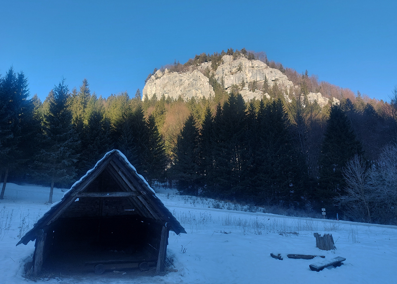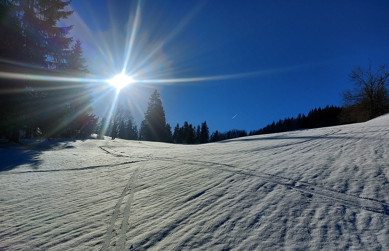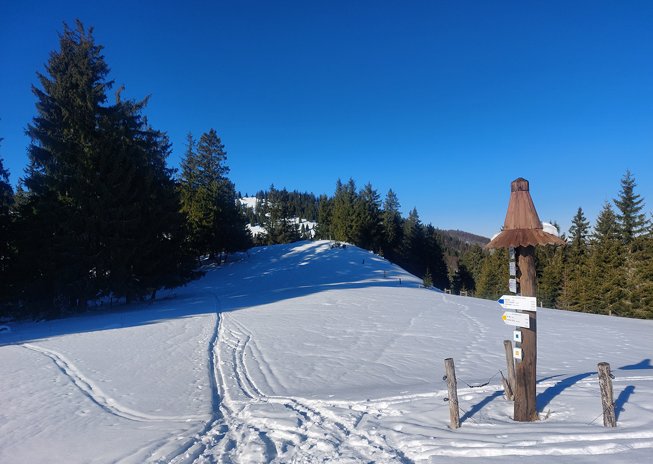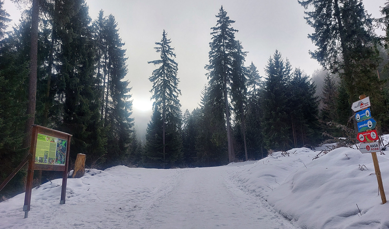Čas pokročil, vlak nepočká, tak už len dole – ale pekne slušne, pod Vtáčnik po cyklotrase. Tá tiež vyleštená do ľadova, predtým v traverzoch pod Šiprúňom dobré snehy aj stopy, hrebeňovka minimálne po Smrekovicu by bola komfortná. Akurát na tých vždy vyfúkaných lúkach pod Šiprúňom skoro nebolo kade preraziť. Nooo tak sa po tráve išlo, a čo?