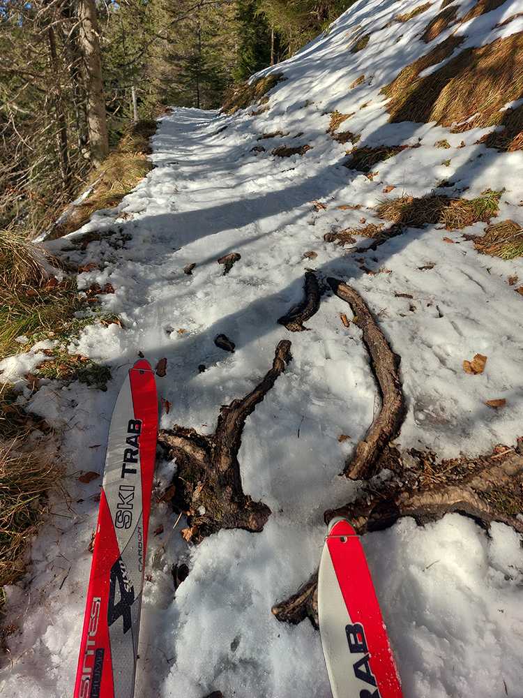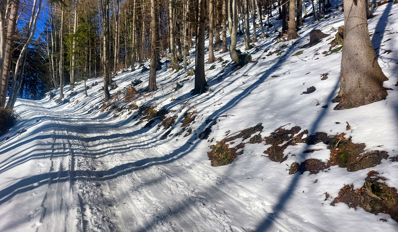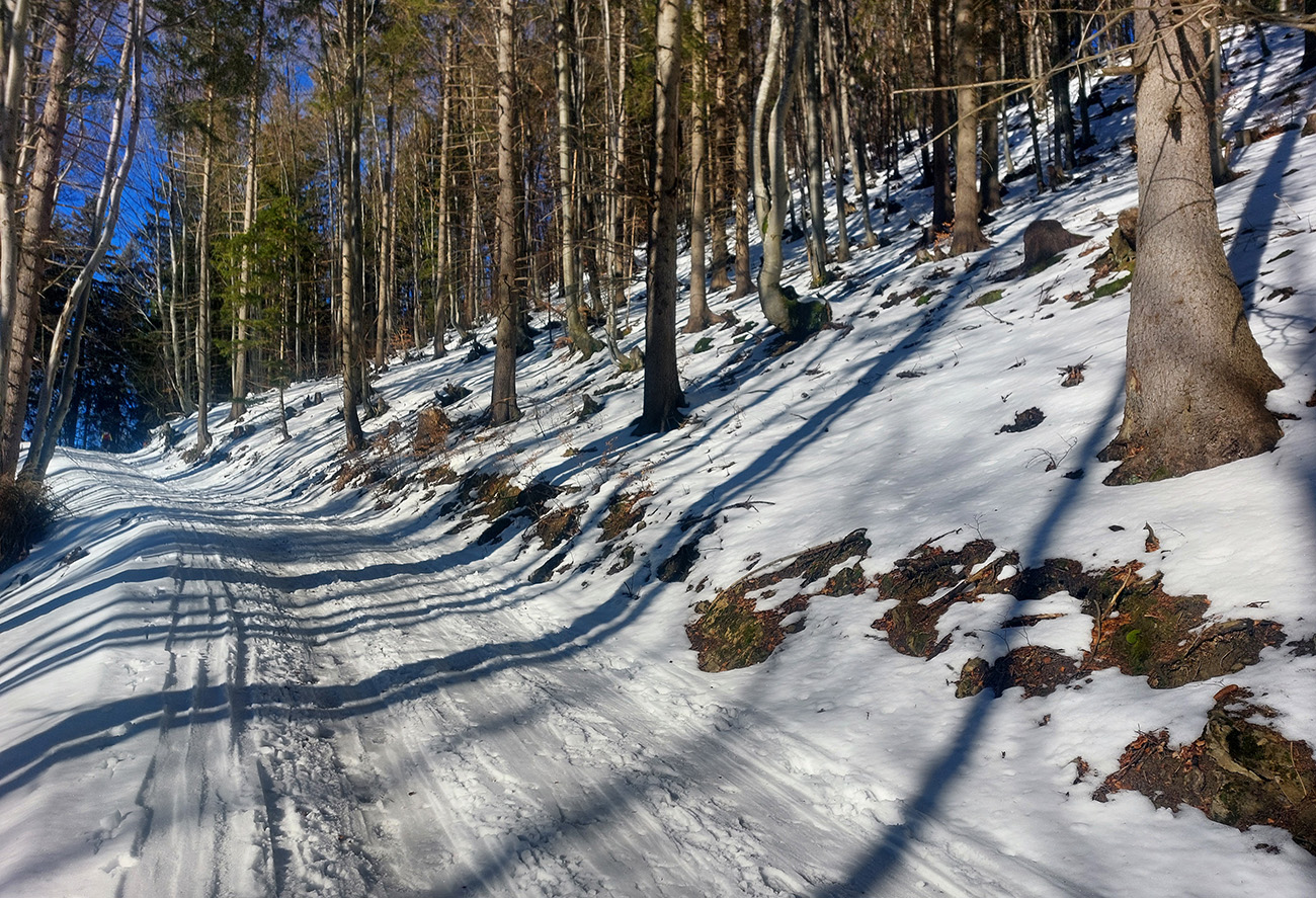 Na križovatke v doline som ušiel doľava, bol som zvedavý, koľko sa snehu odtopilo v traverze lesom na tom strmom južnom svahu. No, je to tam LTT, ale tiež udupané, tak aj to málo zatiaľ stačí, aj na opatrný zjazd: