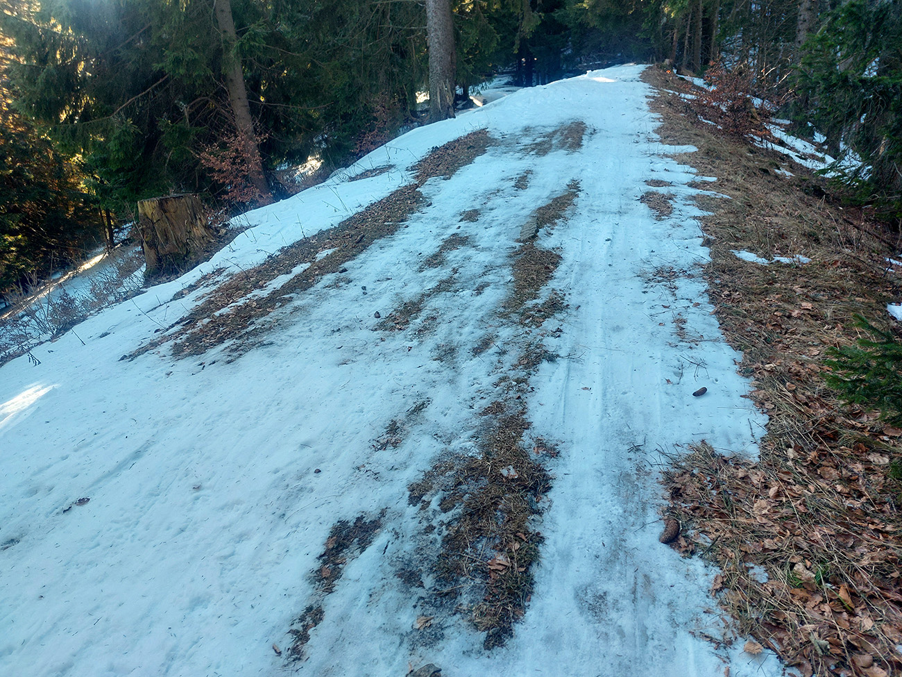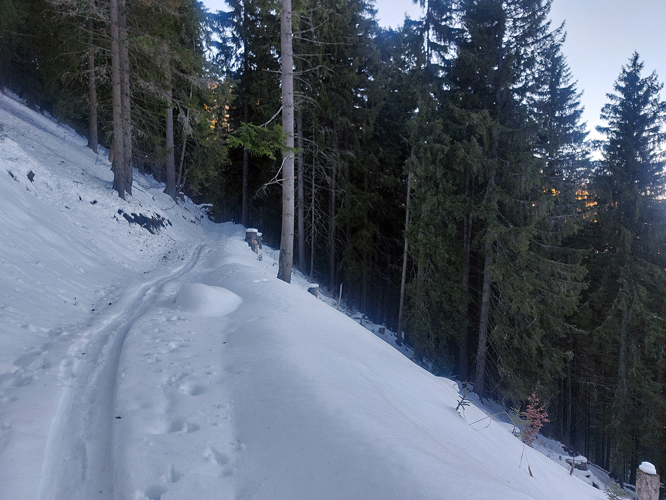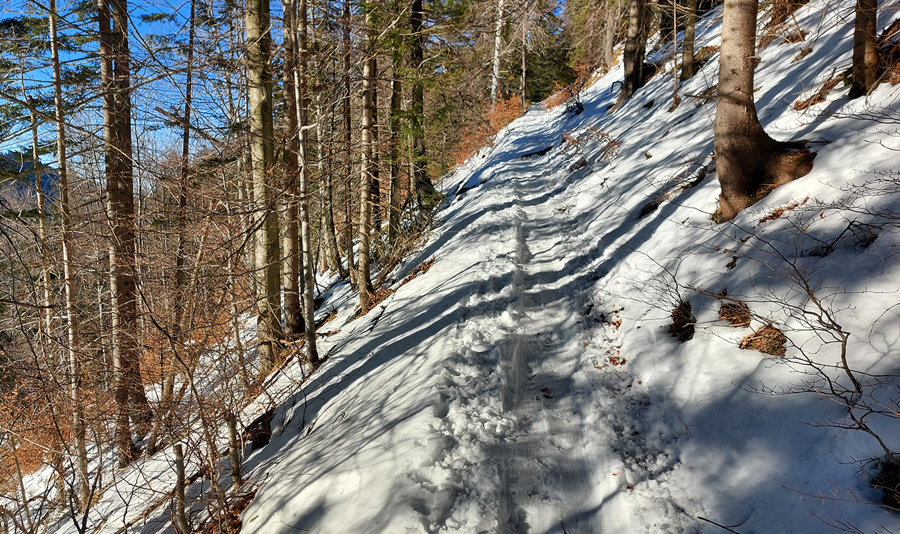 Na križovatke v doline som ušiel doľava, bol som zvedavý, koľko sa snehu odtopilo v traverze lesom na tom strmom južnom svahu. No, je to tam LTT, ale tiež udupané, tak aj to málo zatiaľ stačí, aj na opatrný zjazd: