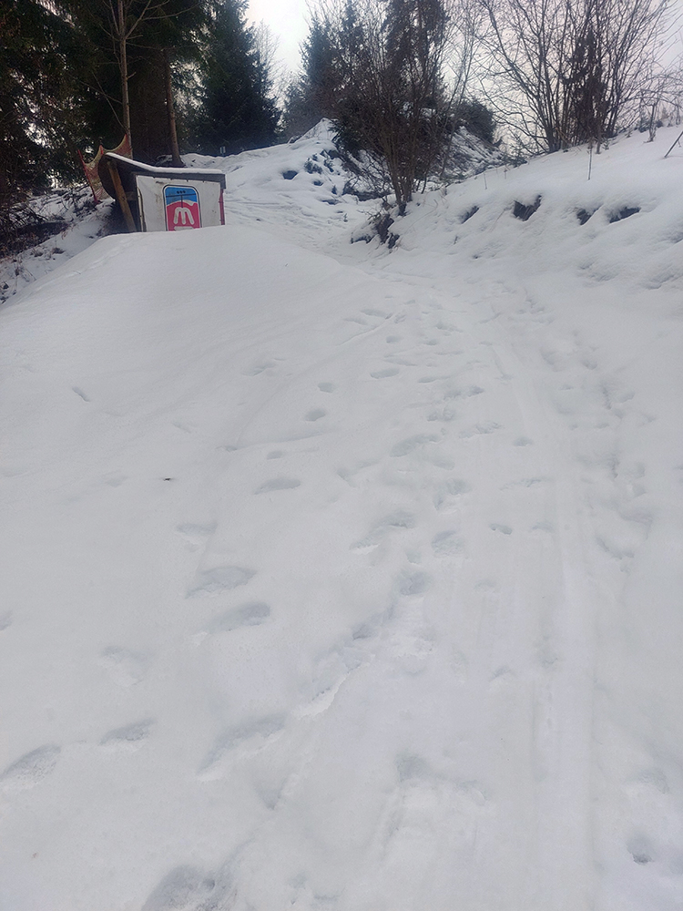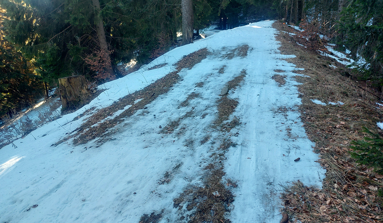 Čiže: sneh državý, zmrznutý, takže na Medvediu cestu som sa vydriapal priamo po cyklotraili popod lanovku. Medvedia cesta vytvrdená skoro na korčule, do ligotava. Smerom dole by to poriadne svišťalo, ale brzdiť nie je problém, pirane vidno.