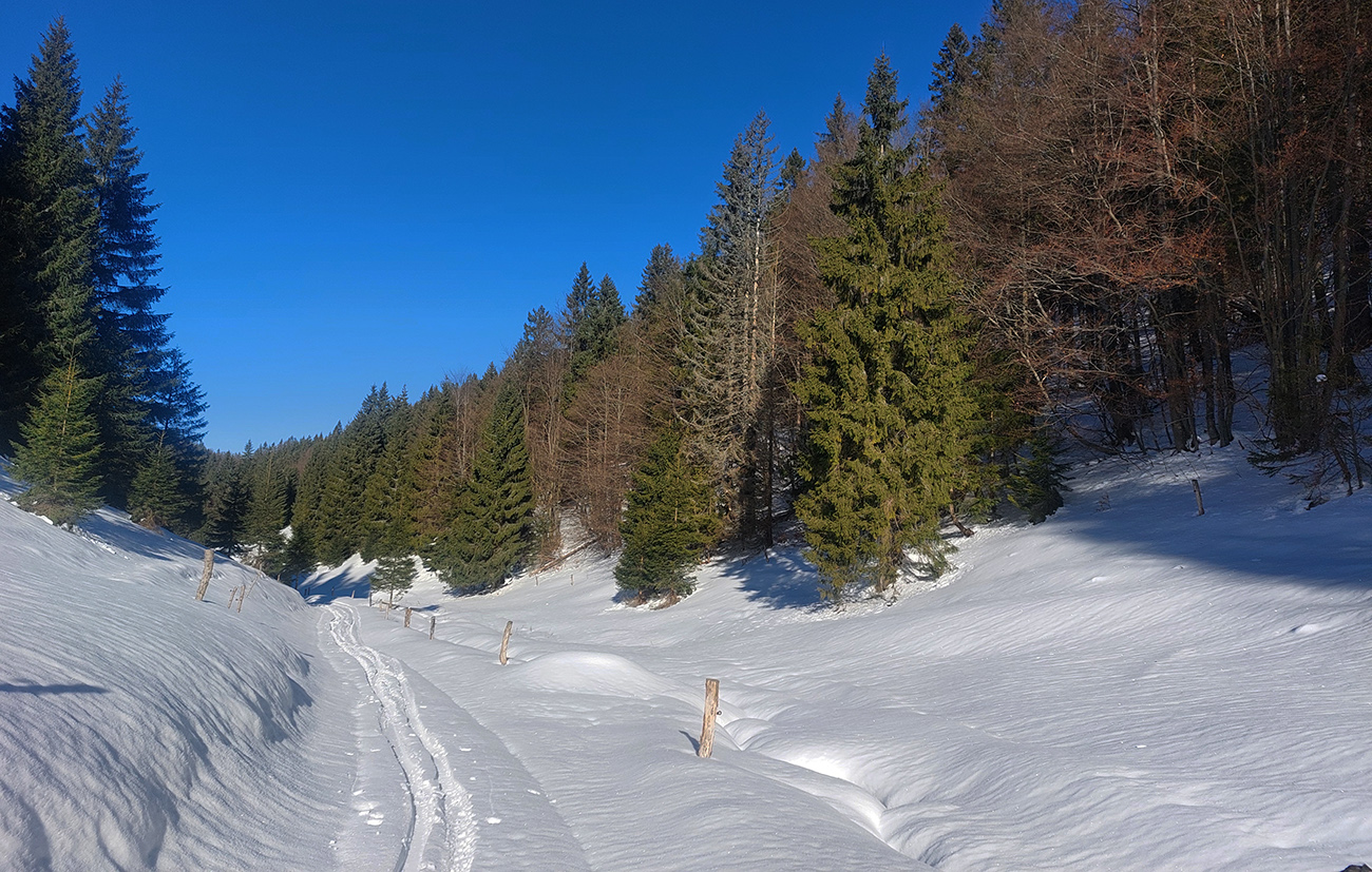 Vyfúkané lúky pod Šiprúňom som teda podišiel zvážnicou cez záver Čutkovskej doliny – tam je snehuuuu doooosť, aj ten potôčik v jame na konci vysnežený parádne. Len na zjazd by to nebolo nič pohodlné – kôrka hnusná a samozrejme je tam dosť úzko.