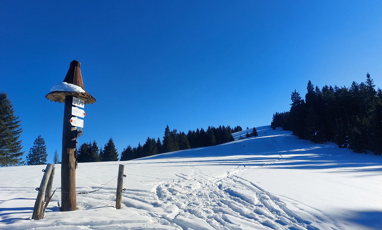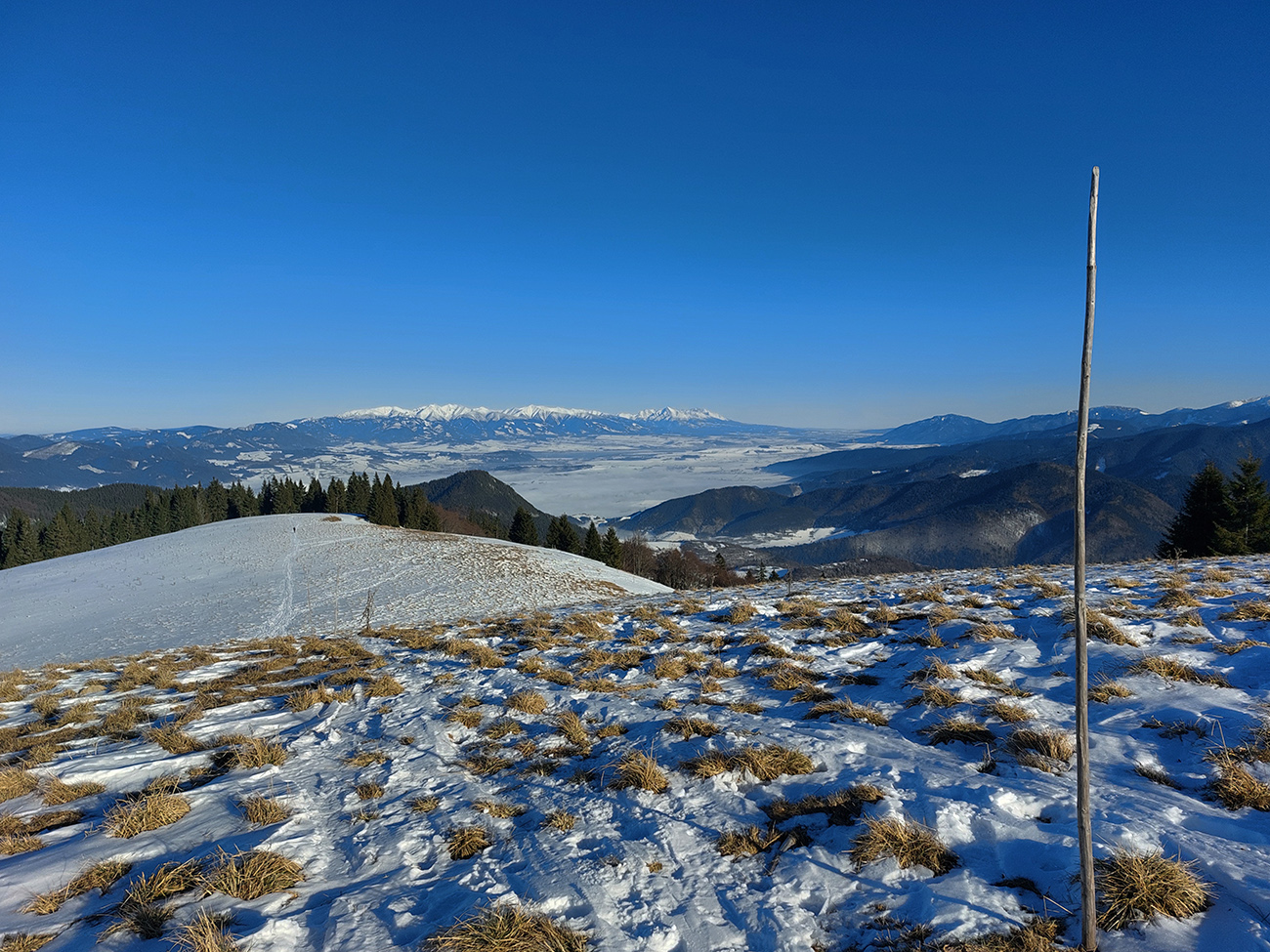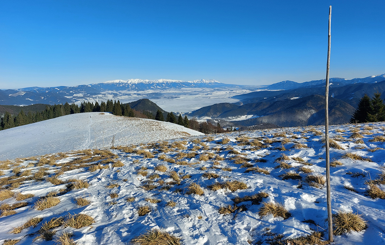 Potom už som si mohol vybrať, kade – po rozľahlých lúkach cez horizont do záveru doliny Bystrého potoka, popri smerovníku Pod Tvarožným grúňom. Na začiatku luxusná stopa, potom nosná kôra. A tie výýýýýhľady!