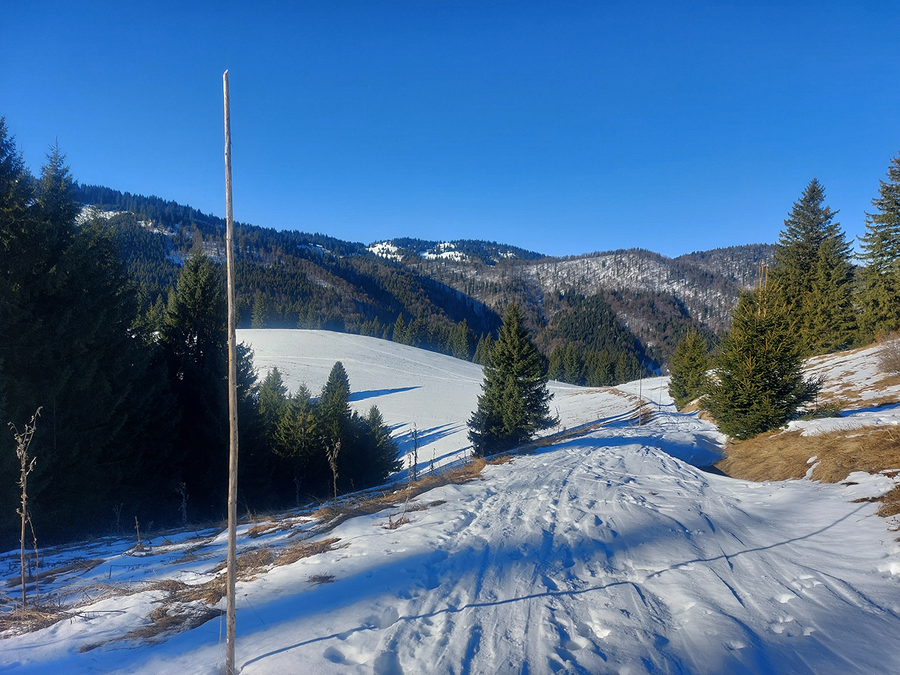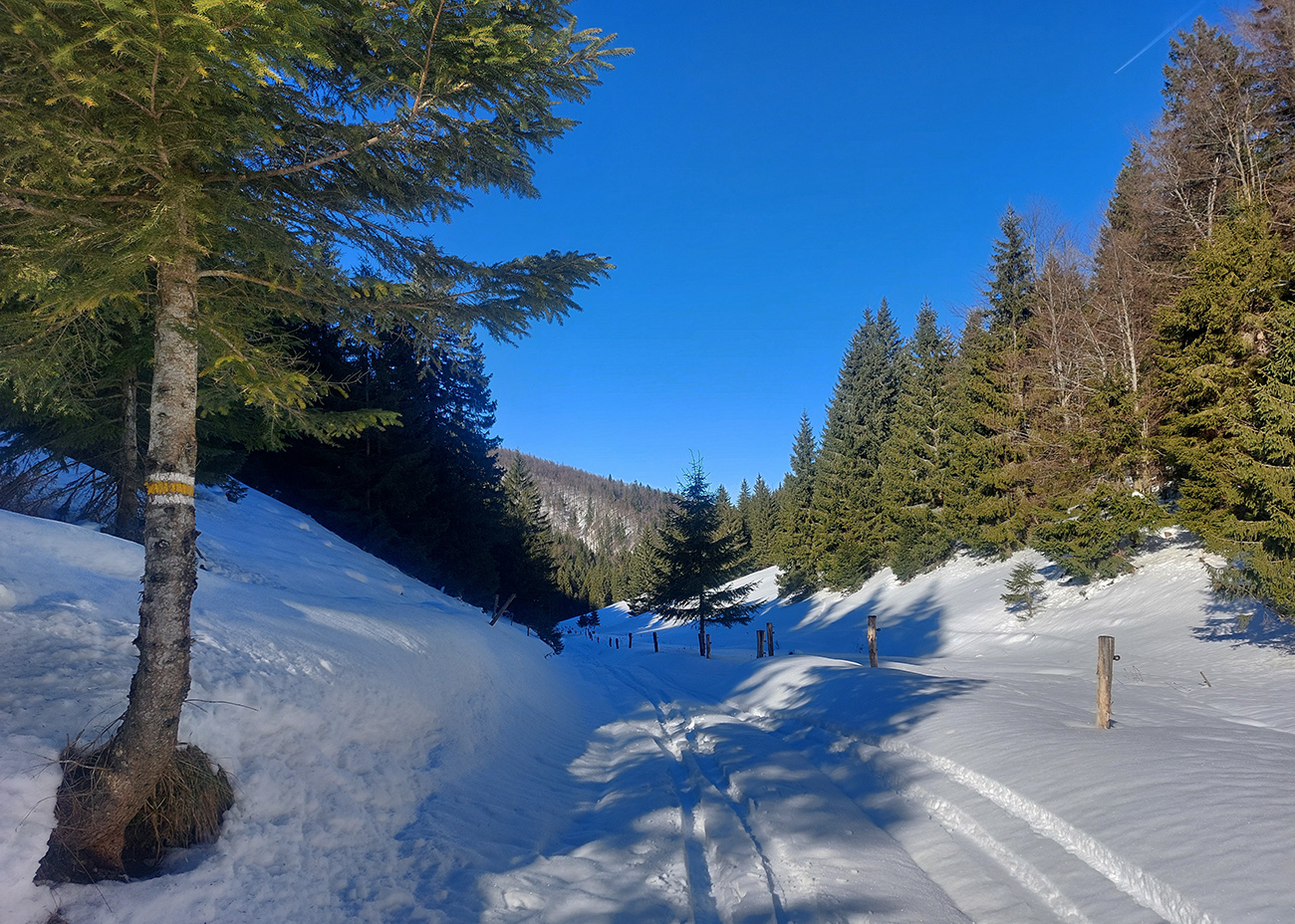 Dole dolinou zopár hlbších stôp, ako zo dva páry lyží dole šmýkali predo mnou, asi ešte „za mäkších podmienok“. Tak som s radosťou využil, že sa cestou nazad nebudem musieť až tak pretláčať s podkladom. Dolinka pekná, snehu dosť, otočil som to „Na jame“, kde sa pripája cyklotrasa z Čutkovskej doliny. Stopy pokračovali tým smerom, ono by sa to v podstate asi aj dalo pekne zokruhovať – buď cez Čutkovskú nazad pod Vtáčnik, alebo z Čutkovskej aj ďalej, až do Hrabova. Snehu v tých severných polohách jesto.