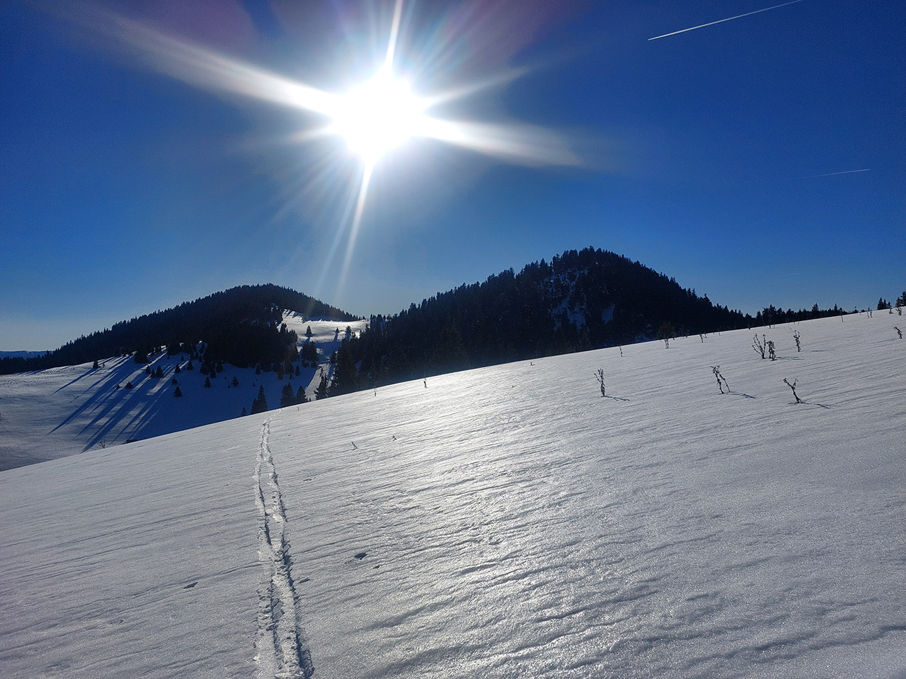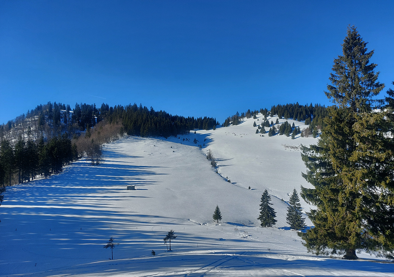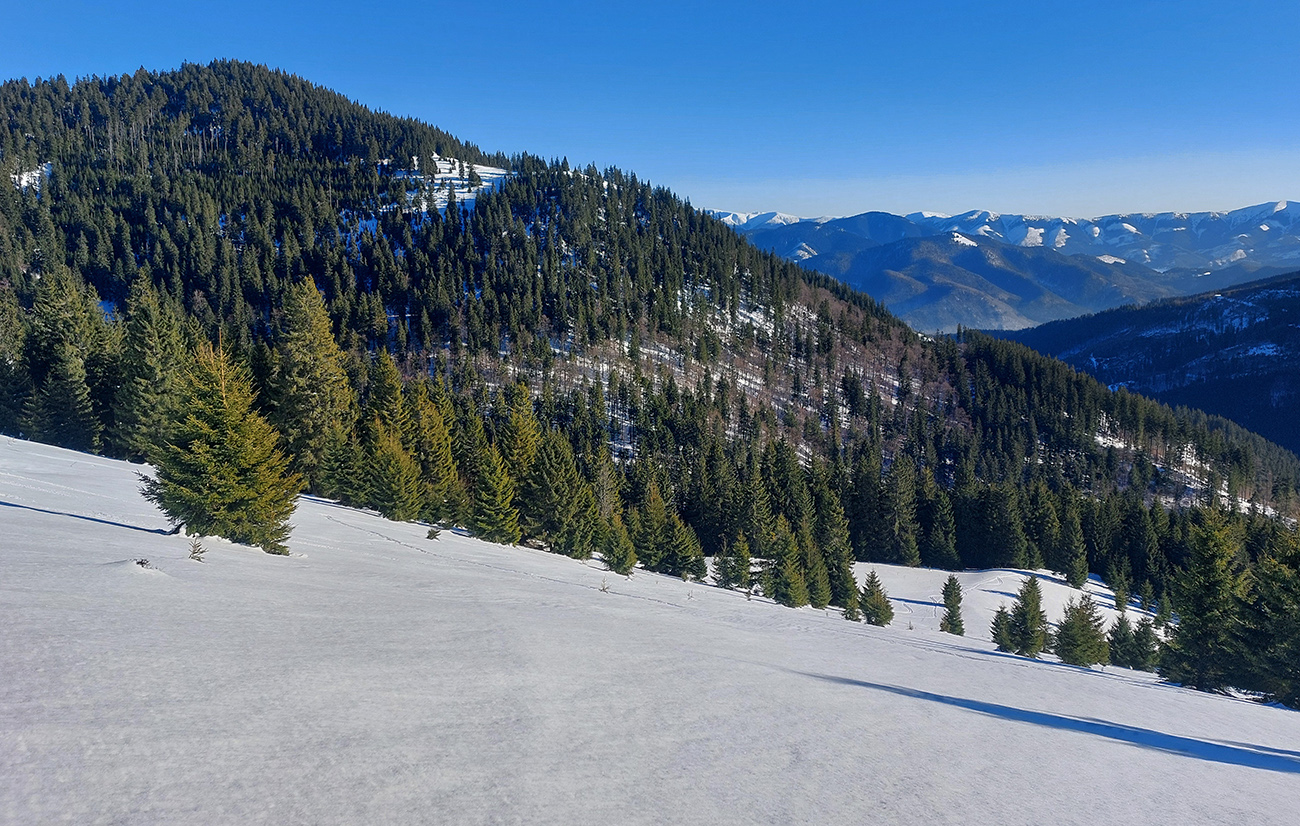 Pretože snehová nádielka z prelomu rokov po oteplení poriadne zamrzla a lyžovanie vo voľnom teréne nie je žiadna slasť, vymýšľal som niečo, kde by som sa mohol šúchať celý čas, najlepšie bez častého odliepania pásov. A tak som vymyslel toto – v „jadre výletu“ sklonom skôr bežkársky terén, lenže pod lyžami buď ľad, alebo sa to naopak prebáralo, takže skialpy tento raz vhodnejšie. Jednoduché to bolo: z Hrabova po Medvedej ceste na Vlkolínske lúky, Suchým Hrabovom pod Vtáčnik, traverzom cez záver Čutkovskej doliny a popod Nižné Šiprúnske sedlo na lúky pod Tvarožným grúňom, dole po žltej dolinou Bystrého potoka a s nejakými zachádzočkami a obmenami nazad: